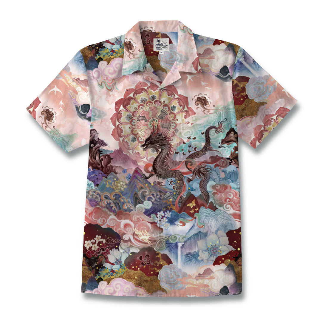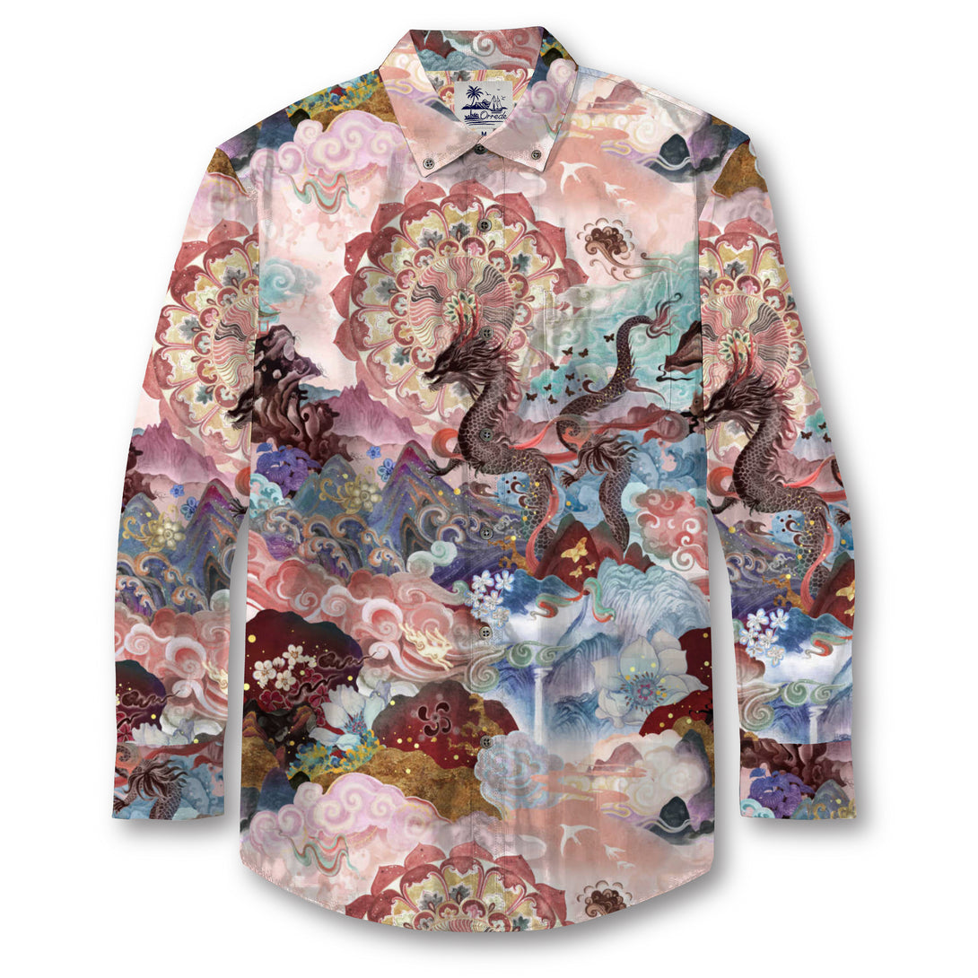 This design unfolds like a mythical dreamscape—an ethereal realm where dragons soar among swirling clouds, radiant mandalas, and celestial mountains. Painted in soft blush tones and deep jewel hues, the composition blends classical Eastern art with fantasy elegance. Gold accents and fluid brushstrokes evoke divine energy, while the dragon at the center symbolizes power, rebirth, and harmony between heaven and earth. A shirt that captures the spirit of legend in motion.