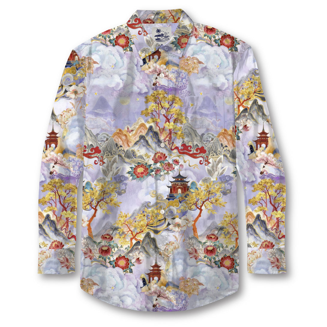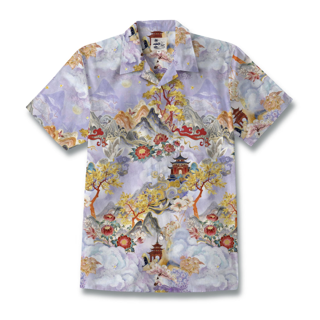This shirt captures the ethereal beauty of Eastern aesthetics. Set against a soft lavender background, the print weaves together elements of mountains, mist, and ancient architecture. Layers of drifting clouds surround majestic peaks, while vivid peonies and golden blossoms bring life and color to the scene. Elegant pavilions and towers rise amid the haze, adorned with red cloud motifs and shimmering stars. The overall design evokes a dreamlike landscape—where the tranquility of traditional ink paintings meets the splendor of divine realms, radiating a sense of refined, otherworldly romance.