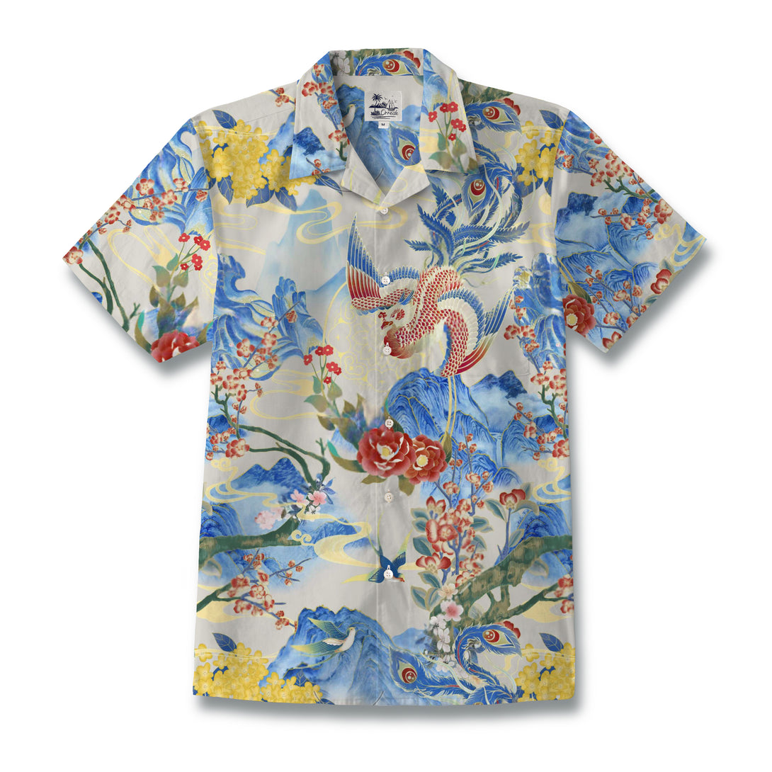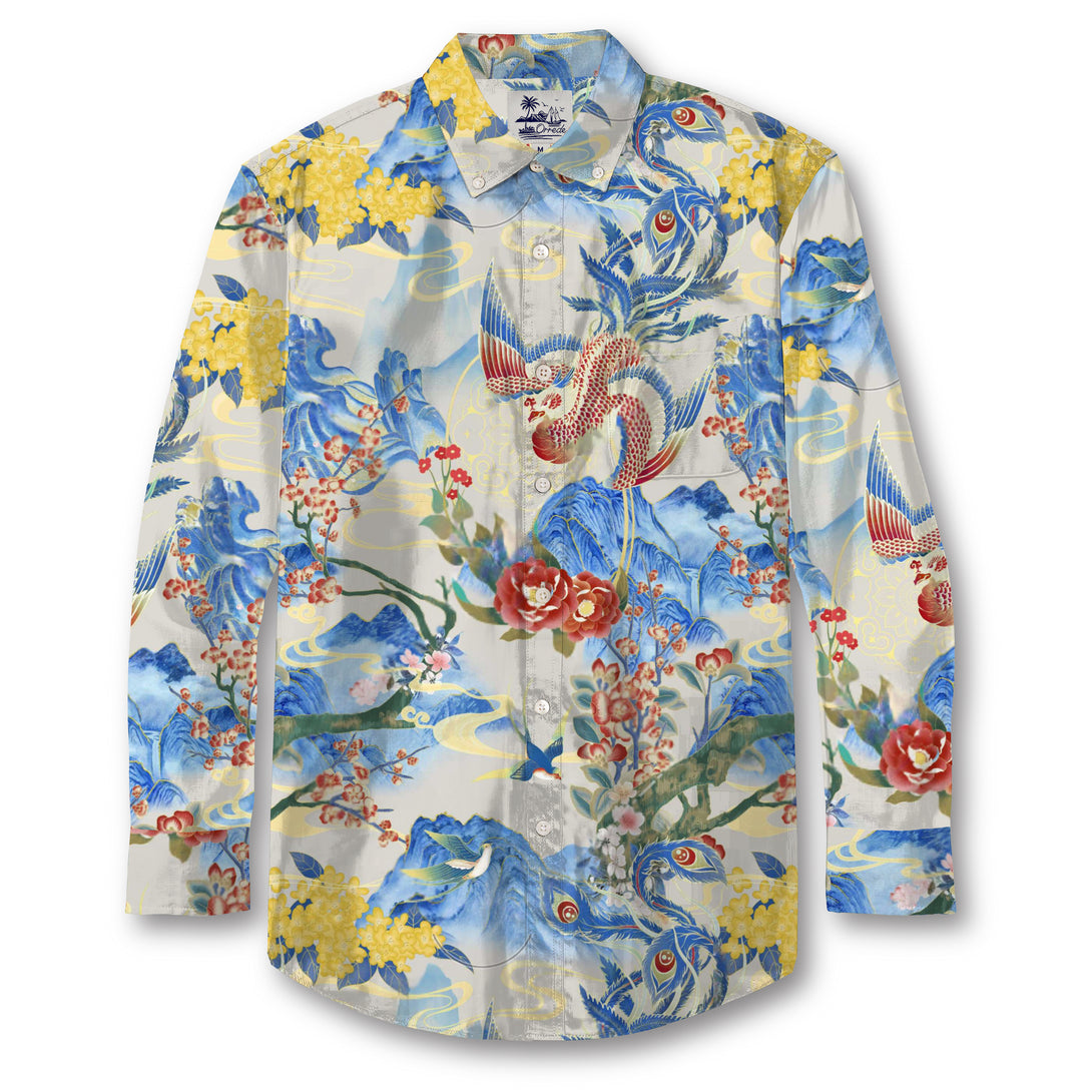 This design features a majestic phoenix soaring amid serene blue mountains and flourishing blossoms, symbolizing renewal, grace, and vitality. The interplay of vibrant reds, gentle yellows, and layered blues evokes a poetic landscape reminiscent of traditional East Asian watercolor paintings. Plum blossoms, peonies, and flowing clouds surround the phoenix, creating a harmonious balance between strength and elegance. The overall look feels both timeless and artistic, like wearing a flowing scroll of living nature.