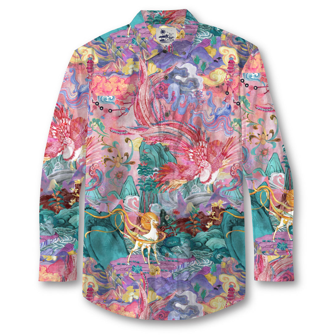 This vibrant design blends mythical elegance with dream-like scenery. A majestic phoenix soars across the fabric in crimson and gold, radiating energy against a sky washed in pink and swirling cloud motifs. Below, an ethereal deer-like creature stands amidst lush jade mountains, flowing streams, and blooming florals, symbolizing purity and harmony. Rich brush-stroke textures and layered watercolor effects evoke traditional East Asian art, creating a luxurious, fantastical landscape filled with motion, mysticism, and celebration. This shirt brings together heavenly creatures and timeless nature to deliver a striking, art-driven statement piece.
