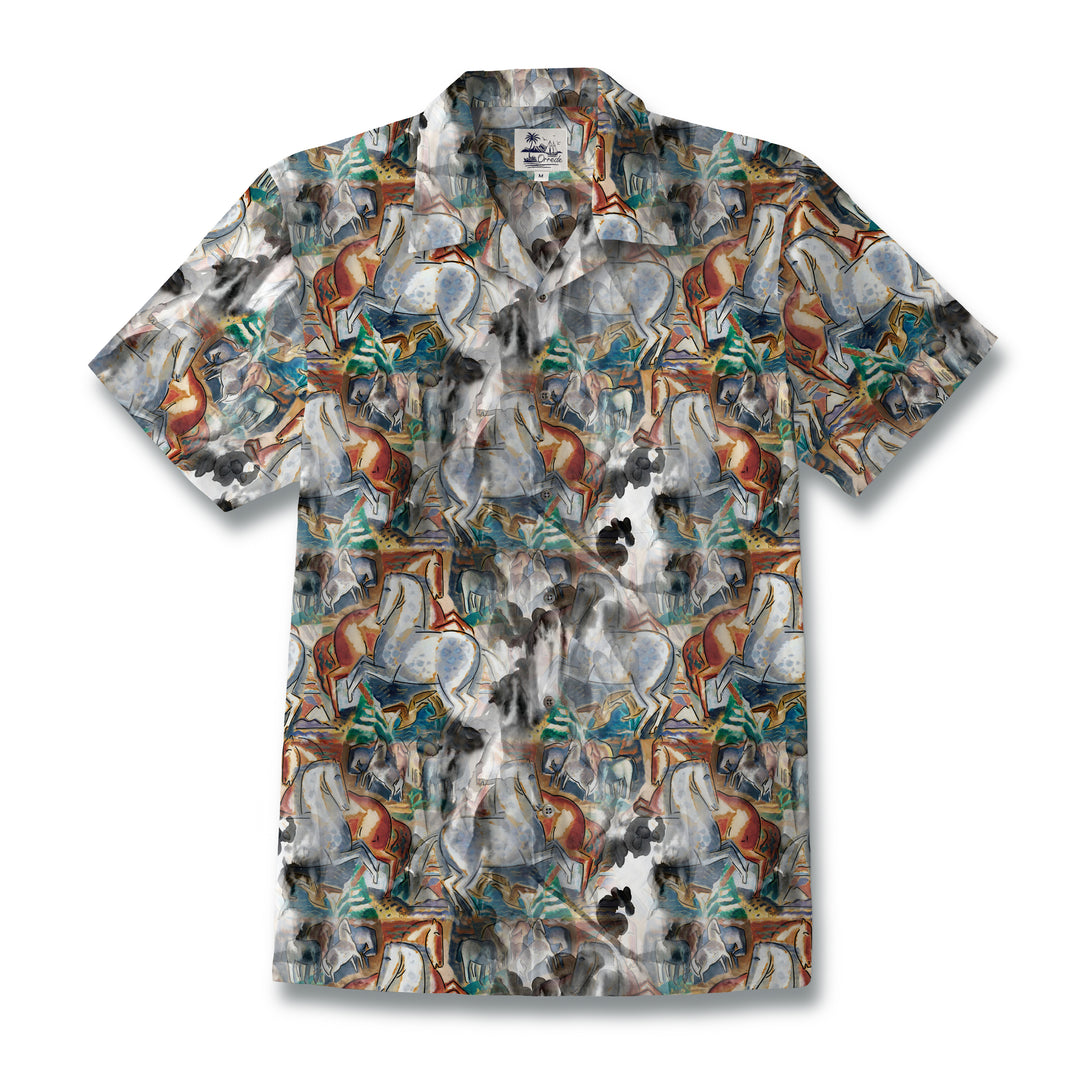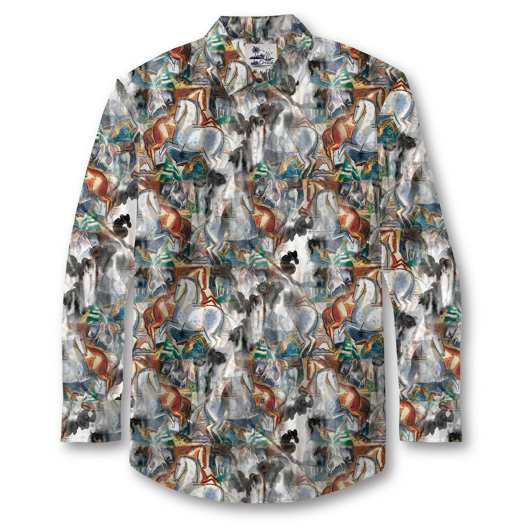 This design channels the spirit of ancient murals and mythic epics, depicting majestic horses in fluid, abstract strokes. Earthy terracotta tones blend with cool blues and jade greens, creating a dynamic contrast that feels both timeless and artistic. Layers of watercolor-like washes and bold sketch lines evoke movement, as if the horses are galloping across dreamlike landscapes. The result is a poetic fusion of history, imagination, and motion—an expressive tapestry for those who appreciate art in every thread.