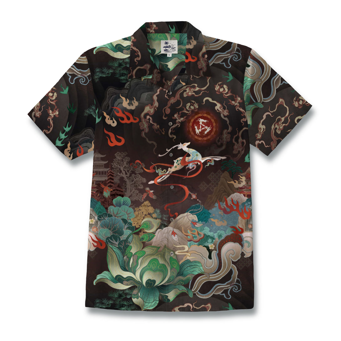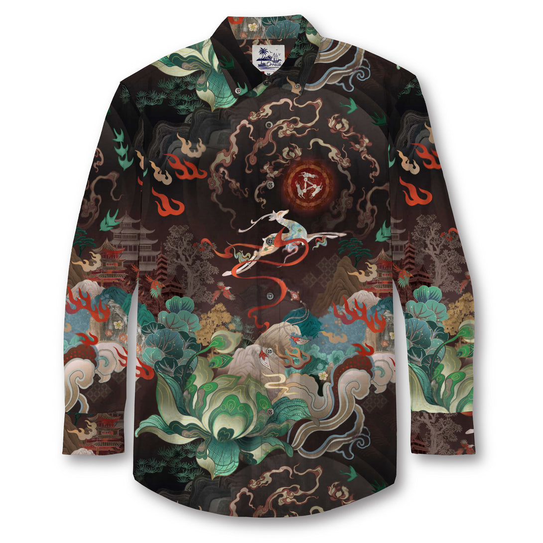 This design unfolds like an ancient myth painted on silk — a vivid tapestry of swirling clouds, divine flames, and ethereal creatures. Against a deep, smoky background, a celestial deer leaps through a storm of fiery wisps, while mythical beasts roam amidst blooming lotuses and mist-covered mountains. Shades of jade, ember, and gold intertwine with flowing smoke patterns, evoking the grandeur of Eastern legends. The scene captures the eternal dance between heaven and earth — where fire meets cloud, and myth breathes life into nature.