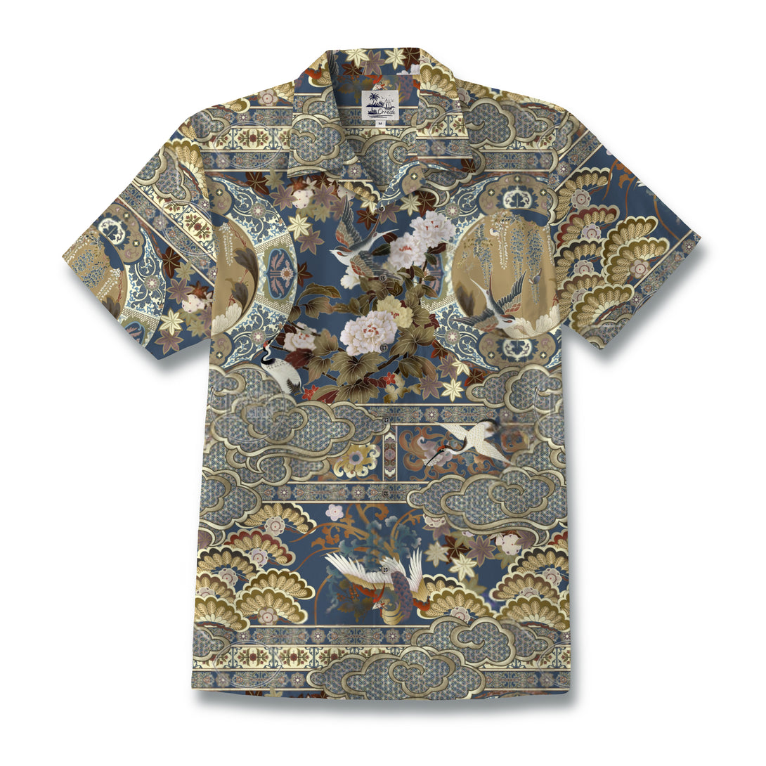 This shirt embodies the essence of Eastern elegance. Set in harmonious shades of blue and gold, it features blooming peonies, graceful cranes, and vibrant birds in flight. Intricate cloud motifs, fan patterns, and geometric accents weave together to evoke the refined beauty of traditional brocade. The result is a piece that feels both timeless and auspicious — a symbol of grace, prosperity, and artistry.