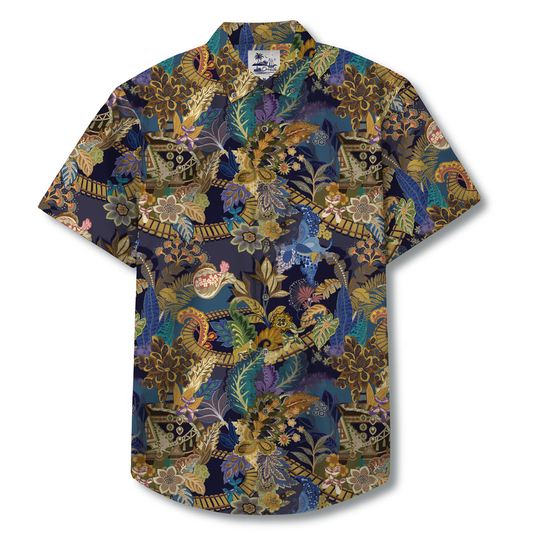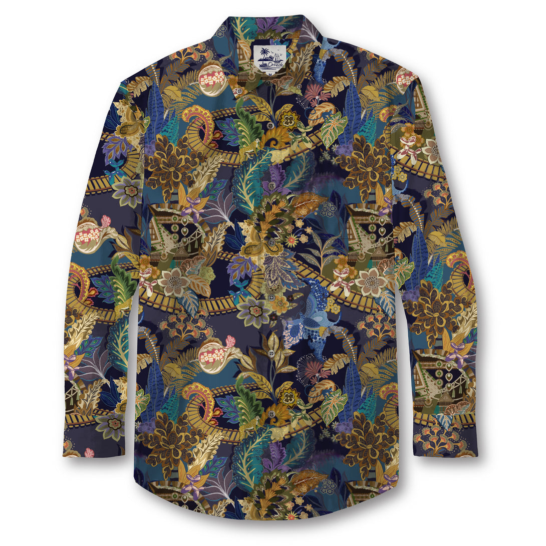 This intricate design captures the essence of an exotic voyage through lush, dreamlike landscapes. The pattern combines golden florals, tropical foliage, and ornamental motifs inspired by vintage tapestries. Shades of deep navy and earthy browns form a rich backdrop, while accents of emerald, indigo, and muted gold add layers of depth and sophistication. The result is an opulent, story-filled composition that evokes adventure, artistry, and timeless elegance.