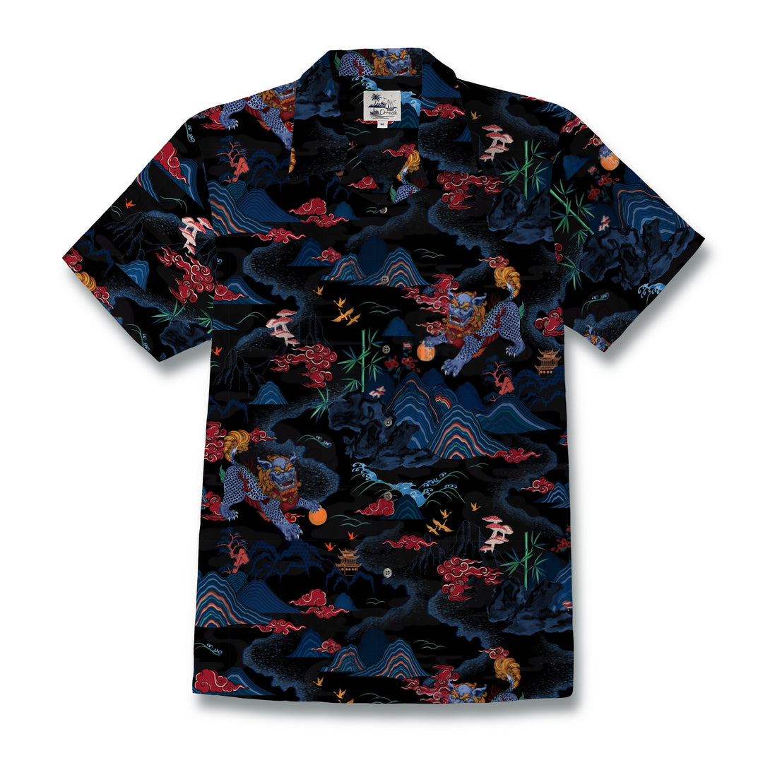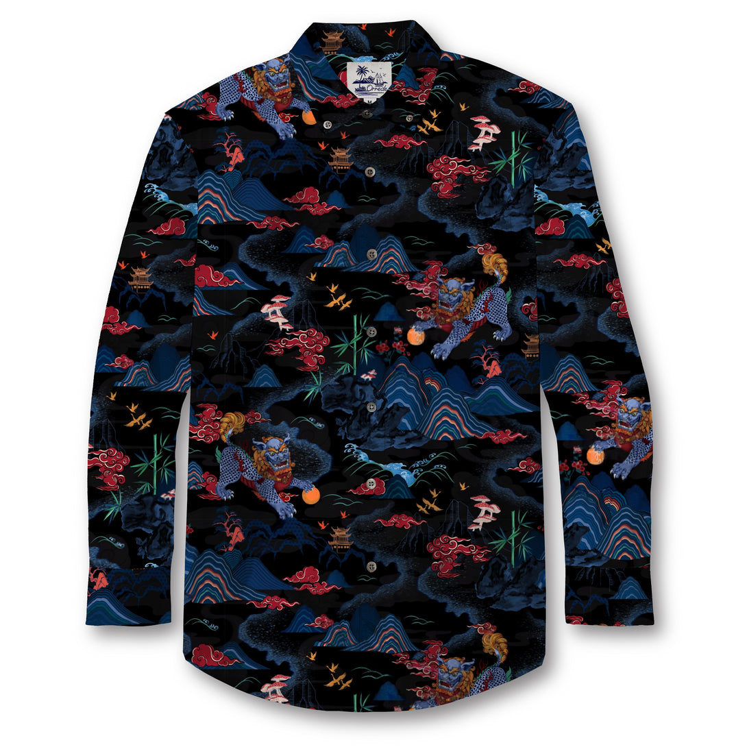 Set against a deep midnight backdrop, this design captures a mystical landscape where mountains rise like waves beneath drifting crimson clouds. Among them roam celestial guardian lions—majestic and fierce—bathed in shades of sapphire, gold, and ember. Bamboo groves and distant cranes add serene balance to the powerful energy of the guardians. The pattern blends myth and nature, evoking the spirit of ancient Eastern legends within a dreamlike nocturnal world.