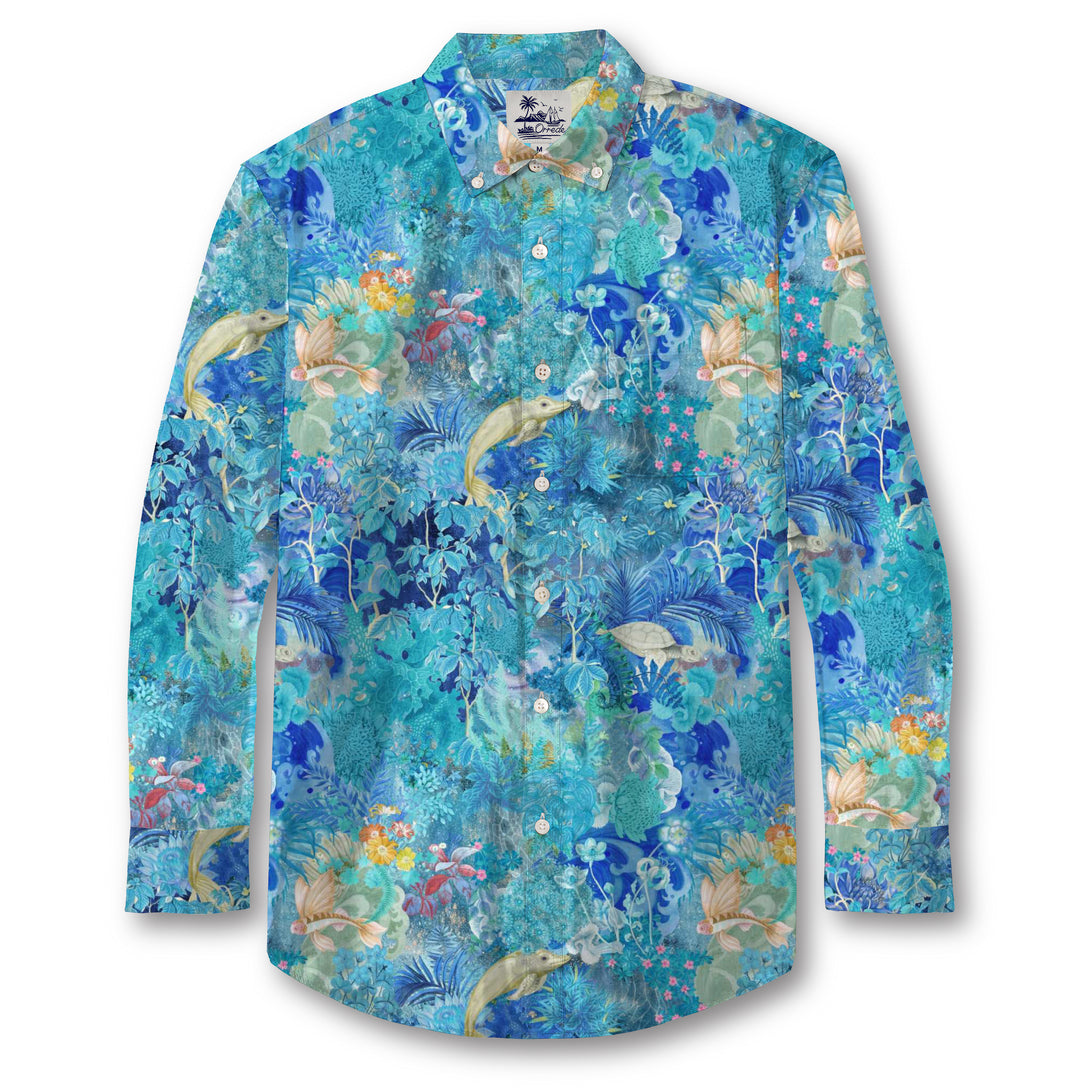 This shirt captures the enchanting beauty of the underwater world. Shades of turquoise, aqua, and deep blue create a vivid ocean tapestry, filled with sea turtles, dolphins, coral gardens, and swaying sea plants. Gentle touches of peach, pink, and yellow coral blooms add warmth to the cool aquatic palette. The intricate, painterly design evokes the serene rhythm of ocean waves — a tribute to the mysteries and wonders of marine life.