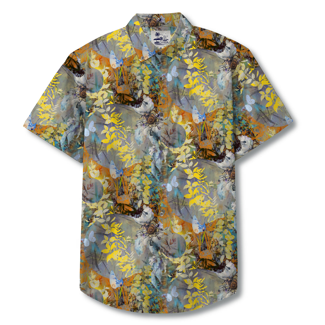 The pattern of this shirt features a gray-blue background, covered with natural elements such as yellow-blue gradient leaves, white butterflies, brown beetles, and spiral-shelled snails. It has an overall watercolor wash texture, with dense and layered patterns, full of tropical natural vibes