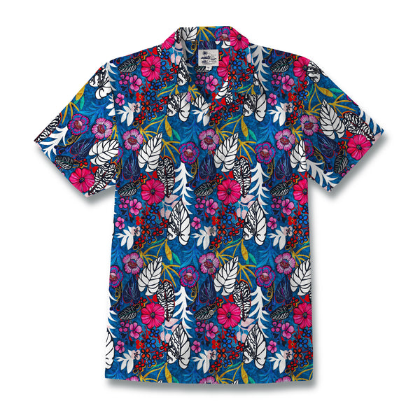 Your shirt will be shipped within 1-7 business days.This shirt features a vibrant, intricate pattern that blends tropical flowers, lush greenery, and geometric elements. The design includes a mix of...