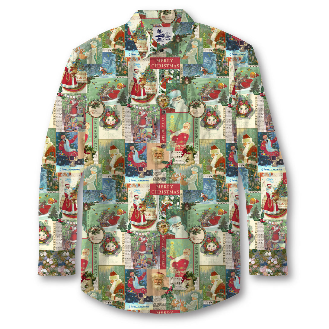 The shirt pattern features a vibrant, nostalgic Christmas theme, consisting of vintage-style holiday postcards and illustrations. The design includes classic depictions of Santa Claus, angels, wreaths, and Christmas trees. Phrases like "Merry Christmas" are scattered across the pattern, surrounded by cheerful festive elements such as holly, snow-covered landscapes, and holiday characters. The artwork blends reds, greens, and neutral tones, creating a warm, vintage holiday aesthetic.