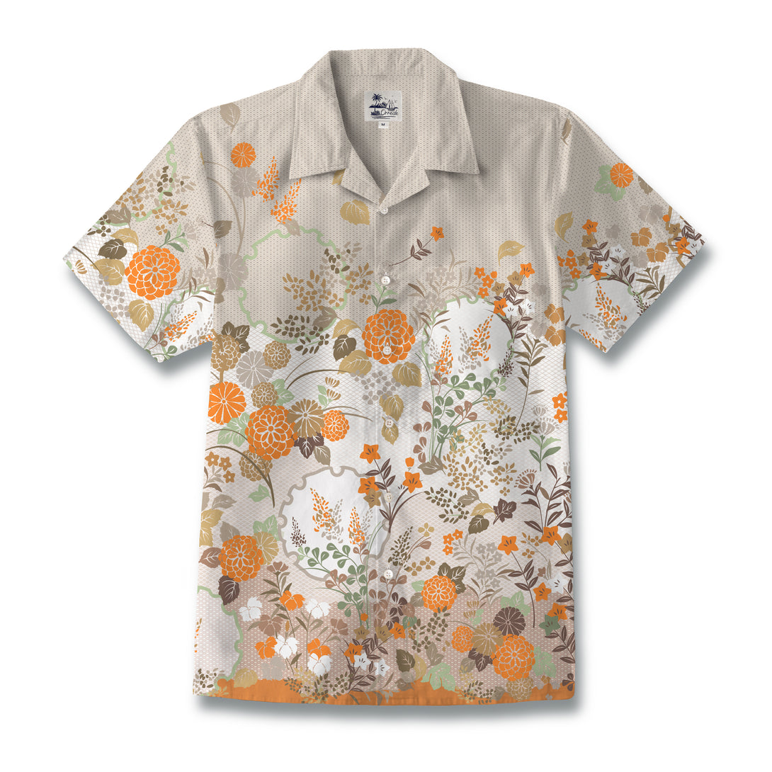 This shirt features a botanical print with a harmonious blend of earthy tones and soft oranges. The design consists of intricate floral and leaf patterns, including detailed chrysanthemum-like flowers in bright orange, with leaves in shades of green, brown, and beige. The background has a subtle grid pattern that gives depth without overpowering the floral elements. The arrangement of the flowers and foliage creates a flowing, organic feel, evoking the tranquility of a garden in late summer.