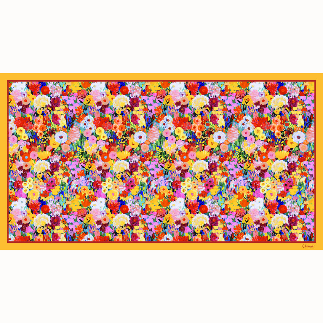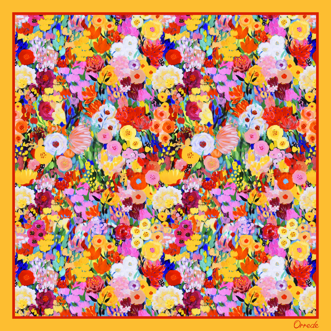 This design bursts with an explosion of vibrant floral patterns, featuring a dazzling array of colors including fiery reds, sunny yellows, deep blues, soft pinks, and lush greens. The dense layering of abstract flowers creates a lively, festive energy, evoking the spirit of a tropical garden in full bloom. The overall look is bold, energetic, and joyfully chaotic, perfect for making a statement in any casual or beach setting.