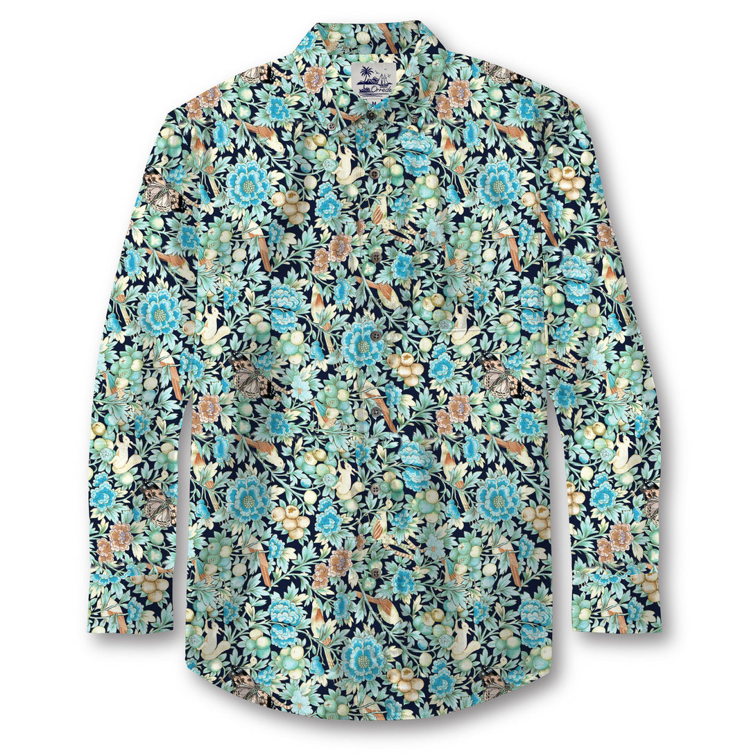 A lush tapestry of blooming florals and hidden wildlife, Eden Reverie captures the dreamlike beauty of a secret garden in full bloom. Shades of turquoise, seafoam, and ivory intertwine with soft touches of amber and moss green, evoking the serenity of nature’s embrace. Birds perch among abundant flowers and ripened fruit, creating a vibrant harmony between life and color. This design feels both vintage and timeless—perfect for those who carry a piece of paradise wherever they go.