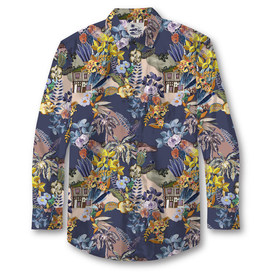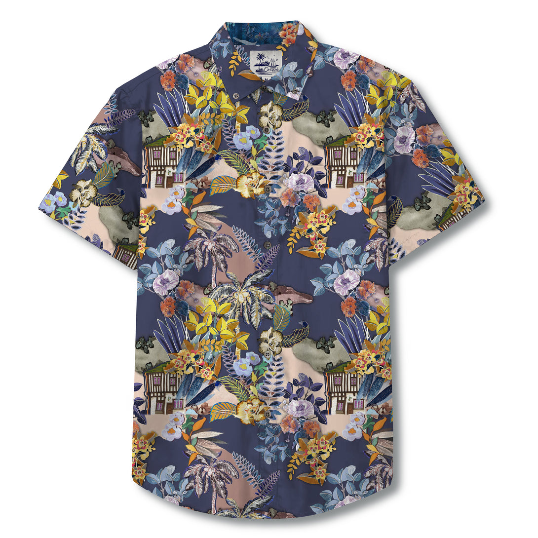 This design is a vibrant tapestry of tropical splendor, blending richly detailed florals with classic island architecture. Set against a deep navy background, the shirt bursts with layered imagery: cascading yellow orchids, soft violet blooms, and watercolor-style palm leaves. Interspersed are quaint wooden cottages, evoking a nostalgic island village nestled within lush gardens. The interplay of warm and cool tones—sunset yellows, coral oranges, dusty purples, and sage greens—creates a balanced, painterly effect. The design invites the wearer to escape into a secluded botanical paradise where nature and tradition coexist in harmony.