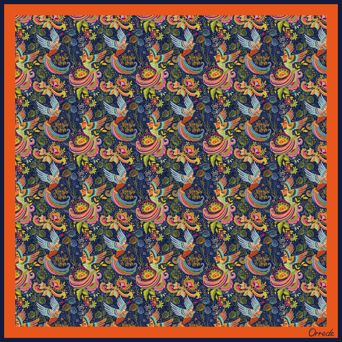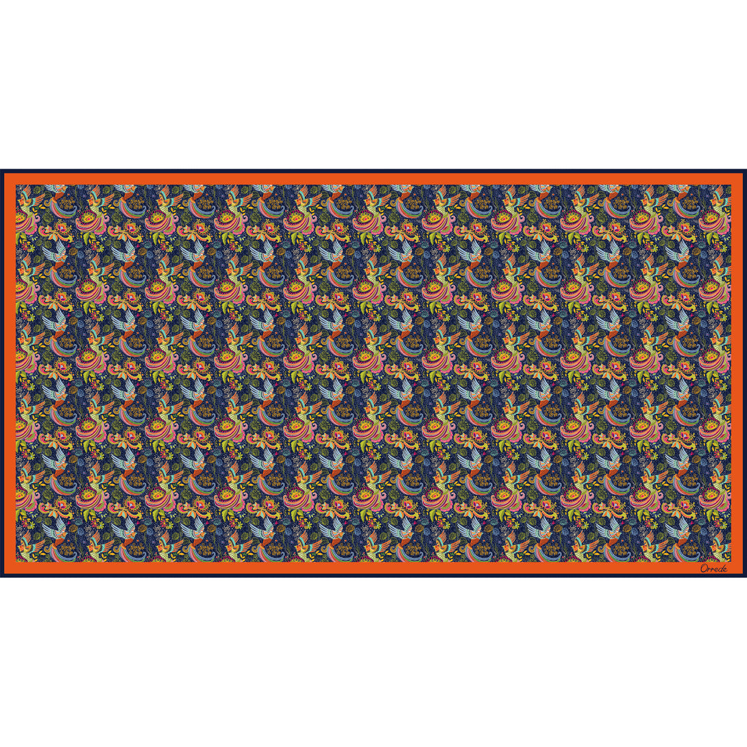This vibrant design bursts with life and fantasy, featuring majestic birds mid-flight, surrounded by ornate floral motifs. The birds are adorned in a patchwork of rich hues—turquoise, orange, coral, and jade—resembling mythical phoenixes. They soar across a deep navy background sprinkled with golden blossoms, swirling vines, and blooming lotus-like flowers. The composition is dense yet harmonious, evoking a lush, enchanted garden in the sky.