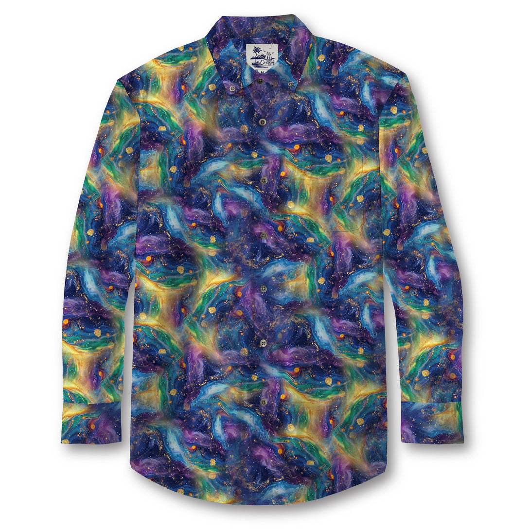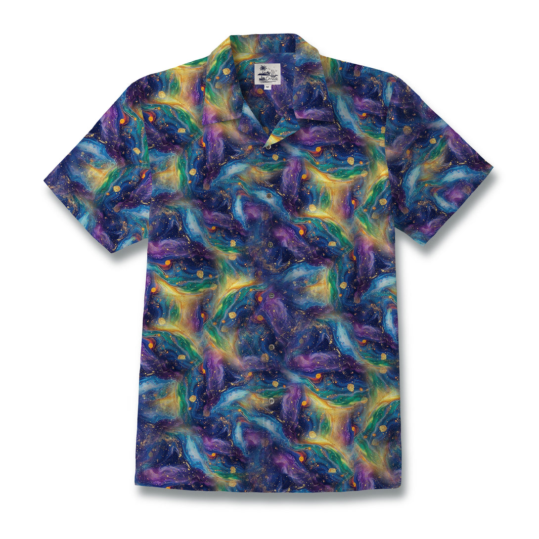 This mesmerizing design captures the infinite beauty of the cosmos in motion. Swirls of deep indigo, violet, and teal intertwine with luminous streams of gold and emerald, evoking the feeling of drifting through a living nebula. Tiny specks of stardust and radiant orbs hint at distant galaxies, blending mystery and wonder into every fold. The result is a vivid, dreamlike pattern that celebrates the harmony between color, light, and imagination — a true cosmic reverie in wearable form.