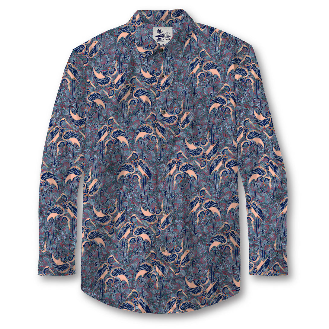 This intricate design features a dynamic composition of elegant cranes in various poses, rendered in deep navy blue and soft peach tones. The birds are illustrated with stylized, almost geometric feathers, creating a rhythmic flow across the pattern. The background is a dense tangle of fine, feathery foliage in cool shades of blue, lavender, and hints of crimson, evoking the look of a misty pine forest at dusk. The interplay between the structured birds and the organic background creates a rich visual texture full of movement and sophistication.