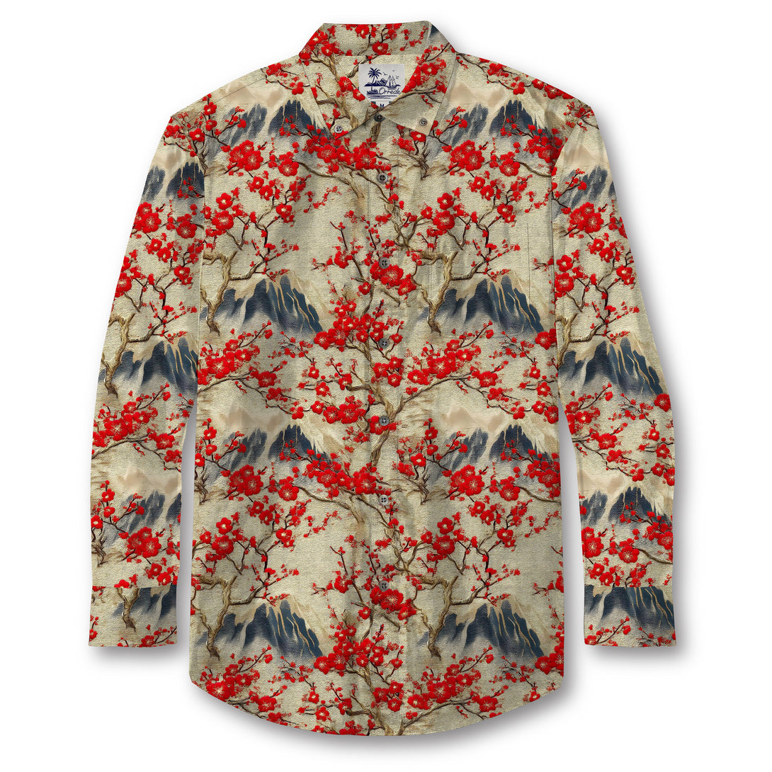 This design features vivid red plum blossoms in full bloom, their delicate petals standing out against a muted beige background. Dark, misty mountain silhouettes rise in the backdrop, creating a poetic contrast between resilience and serenity. The intertwining branches symbolize strength and renewal, evoking a timeless sense of elegance inspired by traditional East Asian art.