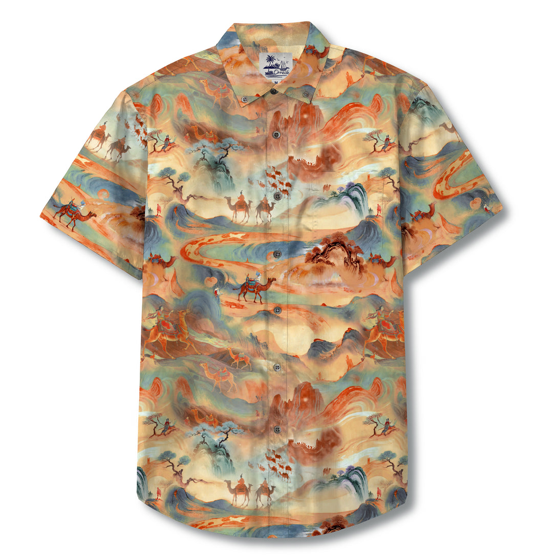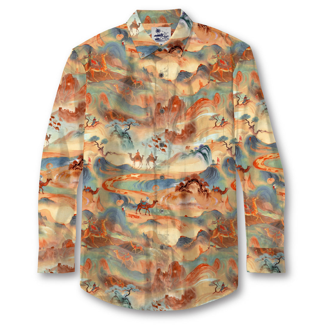This shirt features a poetic desert landscape inspired by traditional ink-wash painting. Flowing dunes, swirling wind, and distant mountains blend together in watercolor-like strokes of sandy beige, warm terracotta, and misty blue. Silhouettes of camel caravans travel across winding paths, evoking ancient trade routes and timeless adventure. The layered scenery creates a dreamlike tapestry—calm yet dynamic—capturing the wandering spirit of explorers and the mystery of the desert horizon.