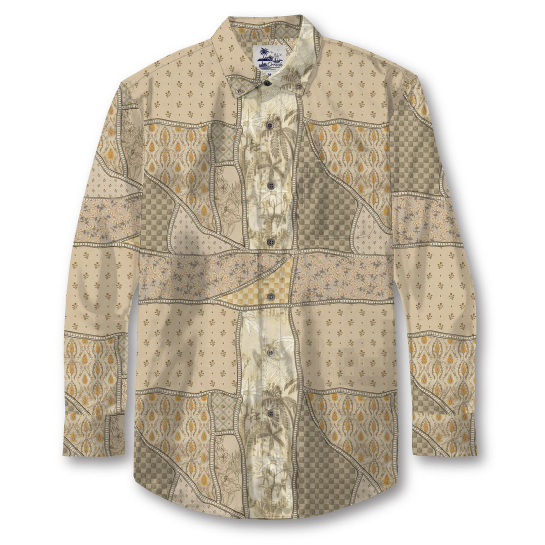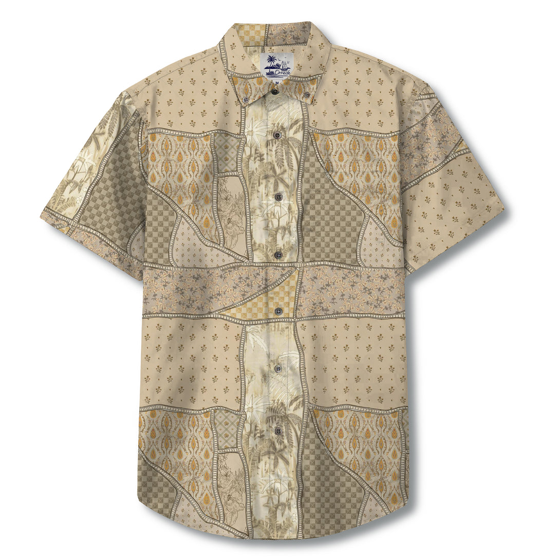 This shirt features a patchwork-style design in warm, earthy tones of beige, sand, and muted olive. The pattern combines tropical palm tree illustrations with vintage floral motifs, checkered textures, and ornamental paisley elements. Each panel is framed with fine border lines, creating a quilted aesthetic reminiscent of desert tapestries. The subtle interplay of geometric balance and organic flow gives the shirt a relaxed yet refined look, perfect for leisurely days under the sun.