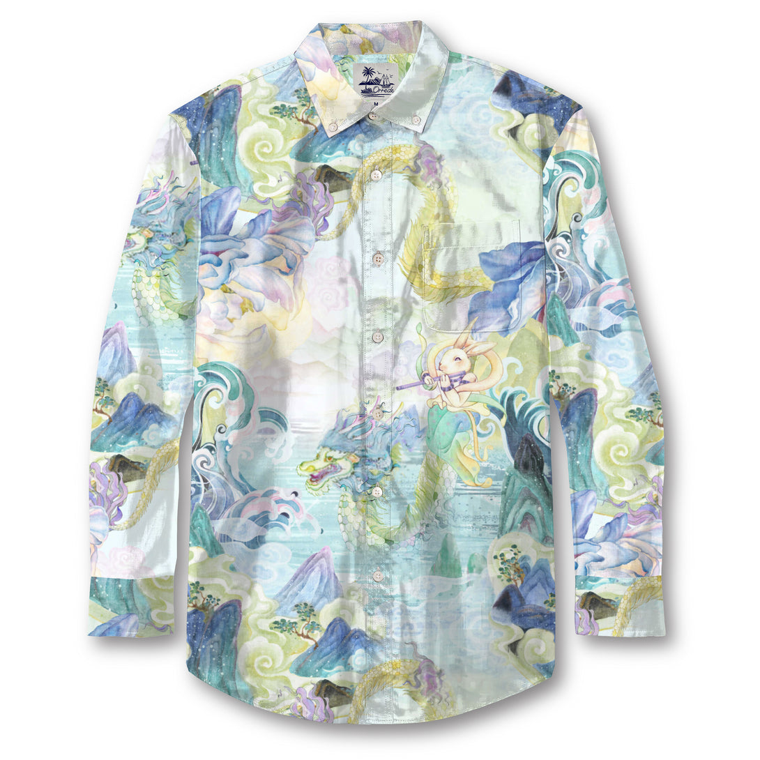 This shirt features a dreamy, watercolor-style pattern blending traditional East Asian motifs with soft, ethereal hues (pale blue, lavender, mint green, and cream). At the center, a graceful celestial rabbit (holding a flute) rides a winding, iridescent dragon—both surrounded by flowing cloud scrolls, stylized ocean waves, and misty mountain landscapes. The design has a whimsical, otherworldly vibe, merging mythical creatures with serene natural elements.