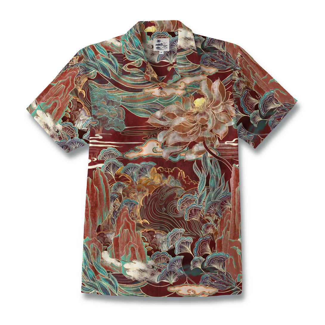 This shirt blends traditional Eastern art with modern fashion design. Its intricate print features landscapes, lotus flowers, and botanical elements, inspired by the color palettes and linework of Dunhuang murals. Set against a warm red-brown base with accents of teal and golden brown, it harmoniously combines vintage artistic charm with everyday wearability, offering a unique expression of Eastern aesthetics in contemporary clothing.