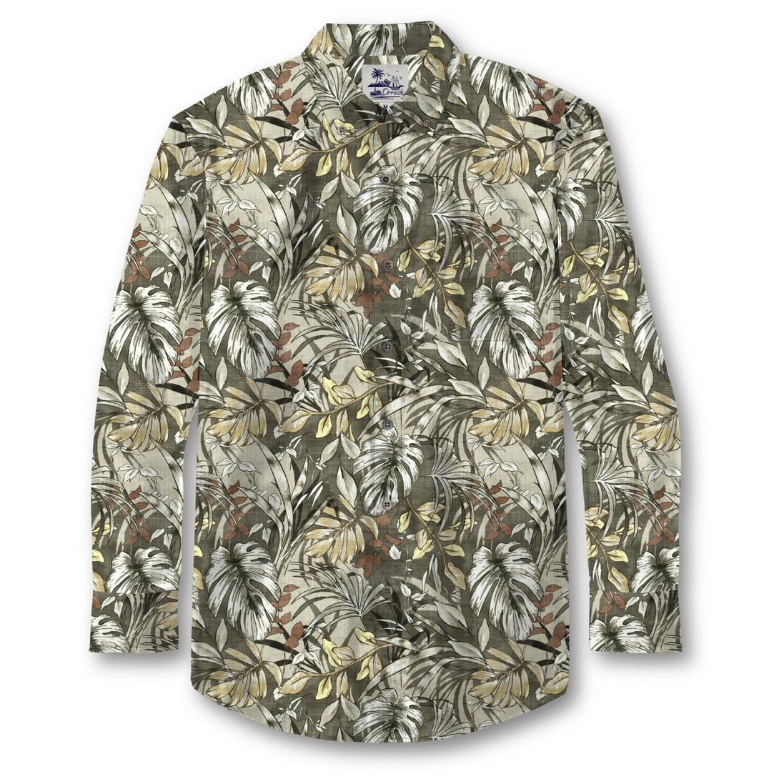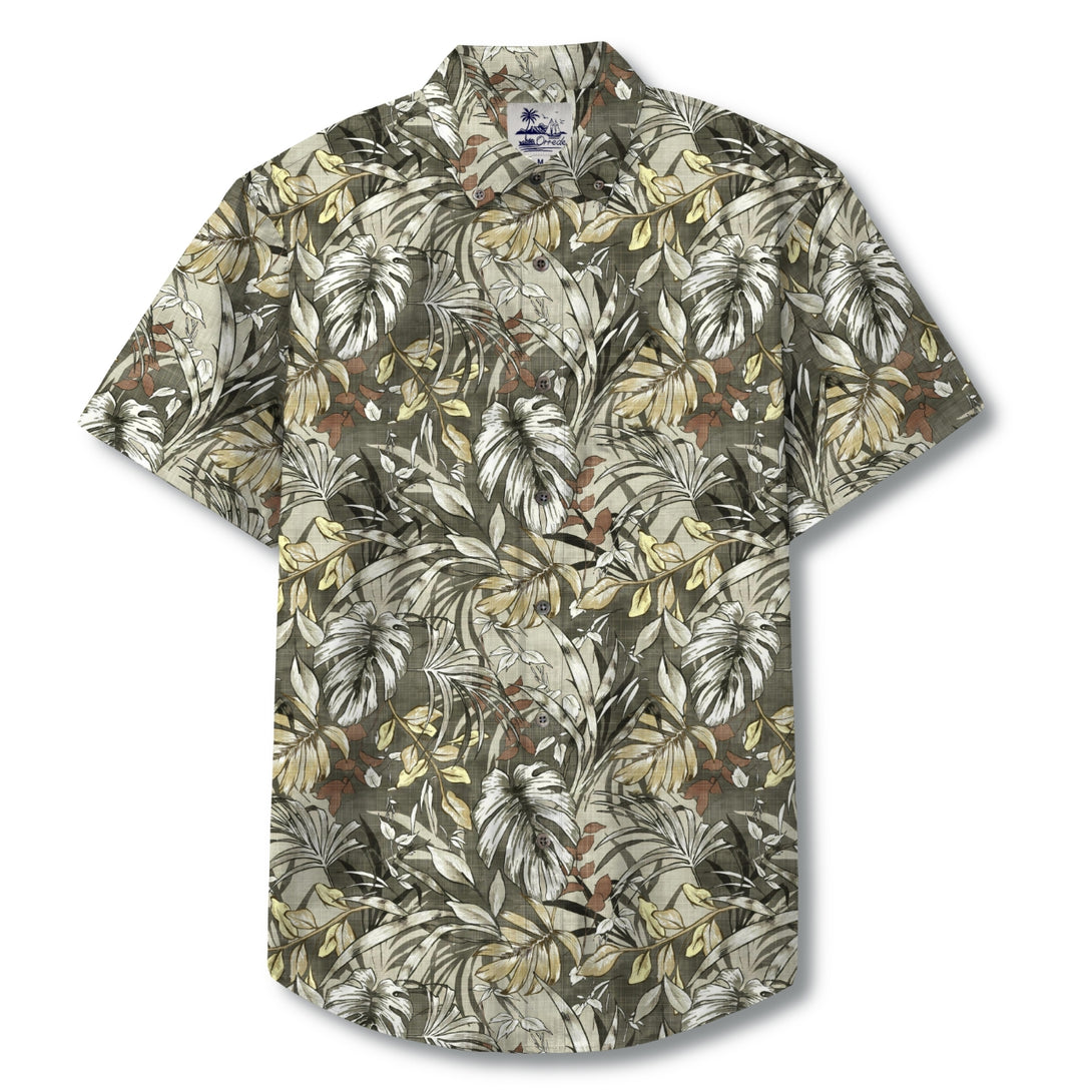 This shirt features a richly layered tropical print, blending large monstera leaves, delicate orchids, and wisps of jungle foliage in muted tones of olive green, sepia, and soft cream. The interplay of light and shadow creates a sense of depth and calm, as if captured in the fading light of dusk within a lush rainforest. Earthy undertones and subtle botanical details give the design a timeless, vintage feel—perfect for those who appreciate nature’s quiet elegance.