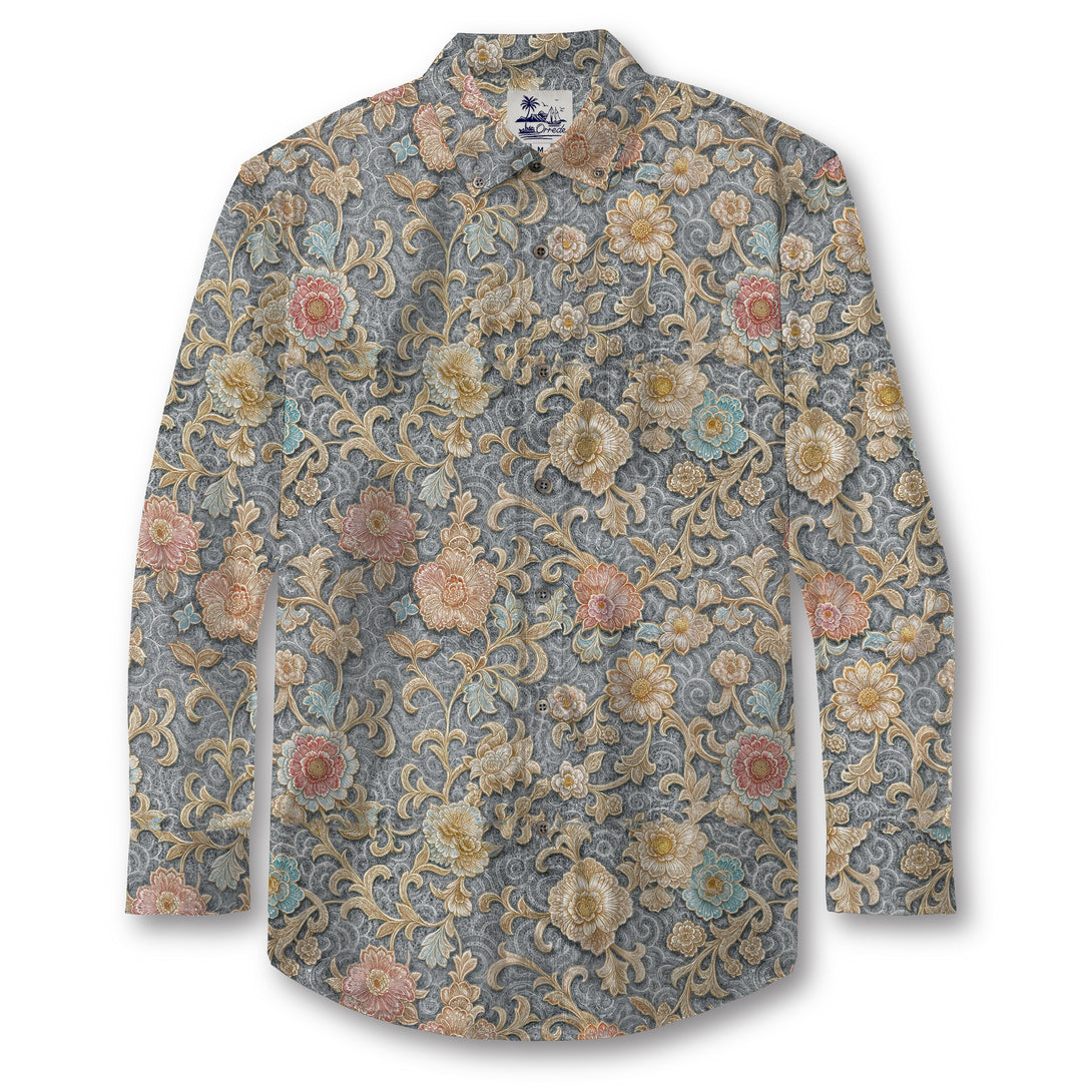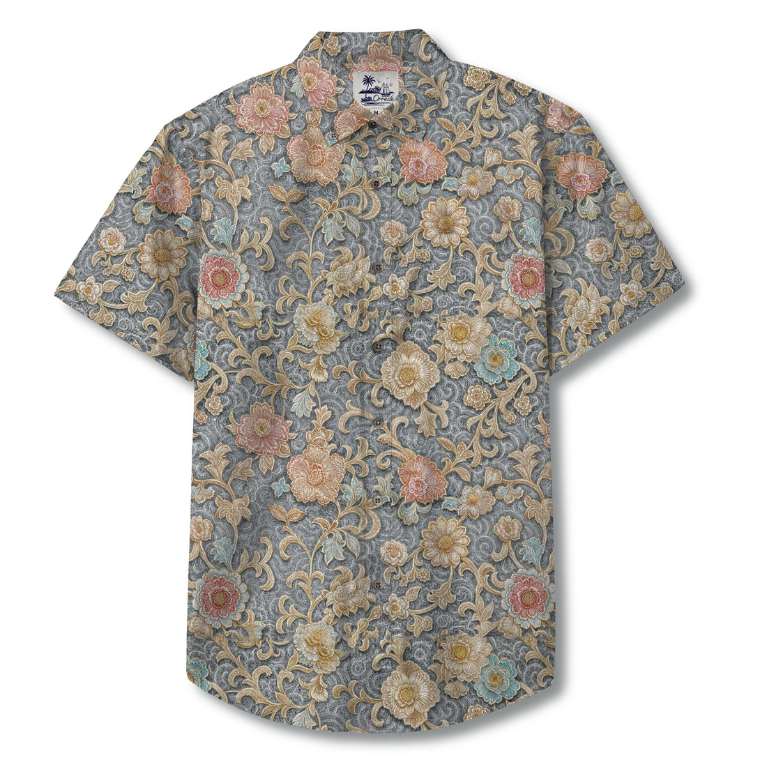 This intricate design evokes the elegance of traditional brocade textile art, blending ornate floral motifs with baroque scrollwork across a rich, slate-grey backdrop. The pattern features chrysanthemums, peonies, and plum blossoms in muted gold, coral, and powder blue tones, reminiscent of imperial Chinese or Persian tapestry work. Each bloom is carefully rendered with embroidered-like detailing, giving the shirt a timeless, regal quality. The flowing vines and symmetrical arrangements create a harmonious, almost meditative rhythm, echoing classical artistry passed down through dynasties.