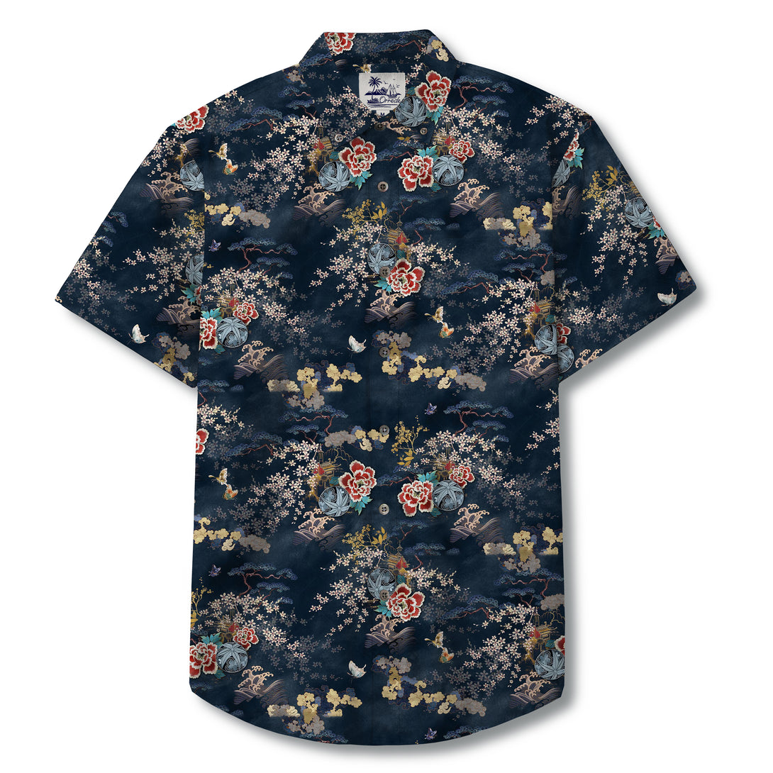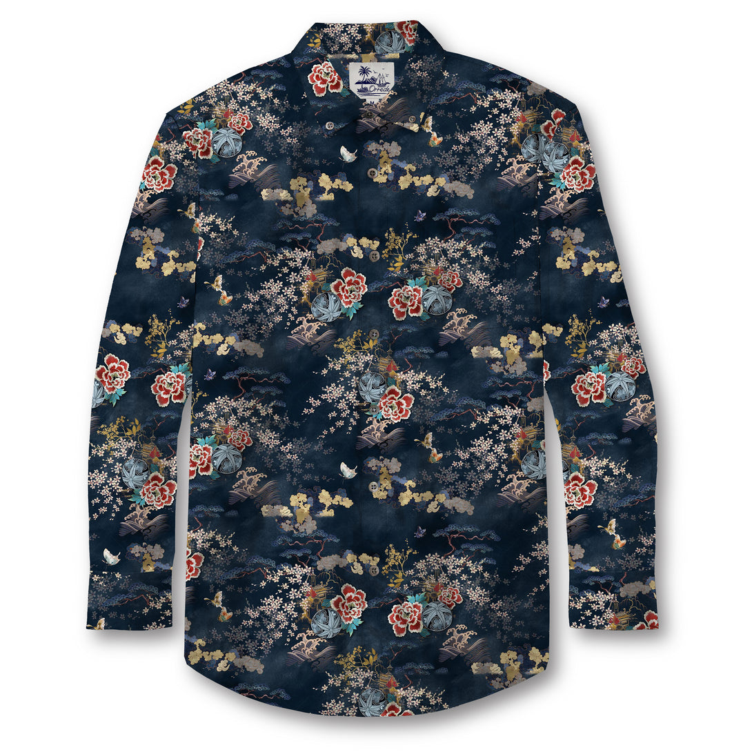 A mesmerizing fusion of nature and tradition, Ethereal Garden captures the timeless elegance of Japanese-inspired artistry. Set against a deep midnight blue background, the pattern features delicate cherry blossoms, lush peonies in shades of red and blue, and golden foliage interwoven with serene landscapes. Soft clouds drift across the design, while graceful birds add a touch of life and movement. This shirt embodies tranquility and refinement, making it a perfect blend of classic aesthetics and contemporary style.
