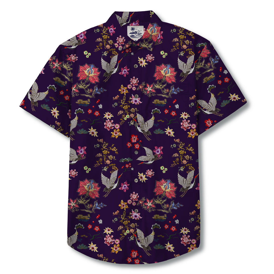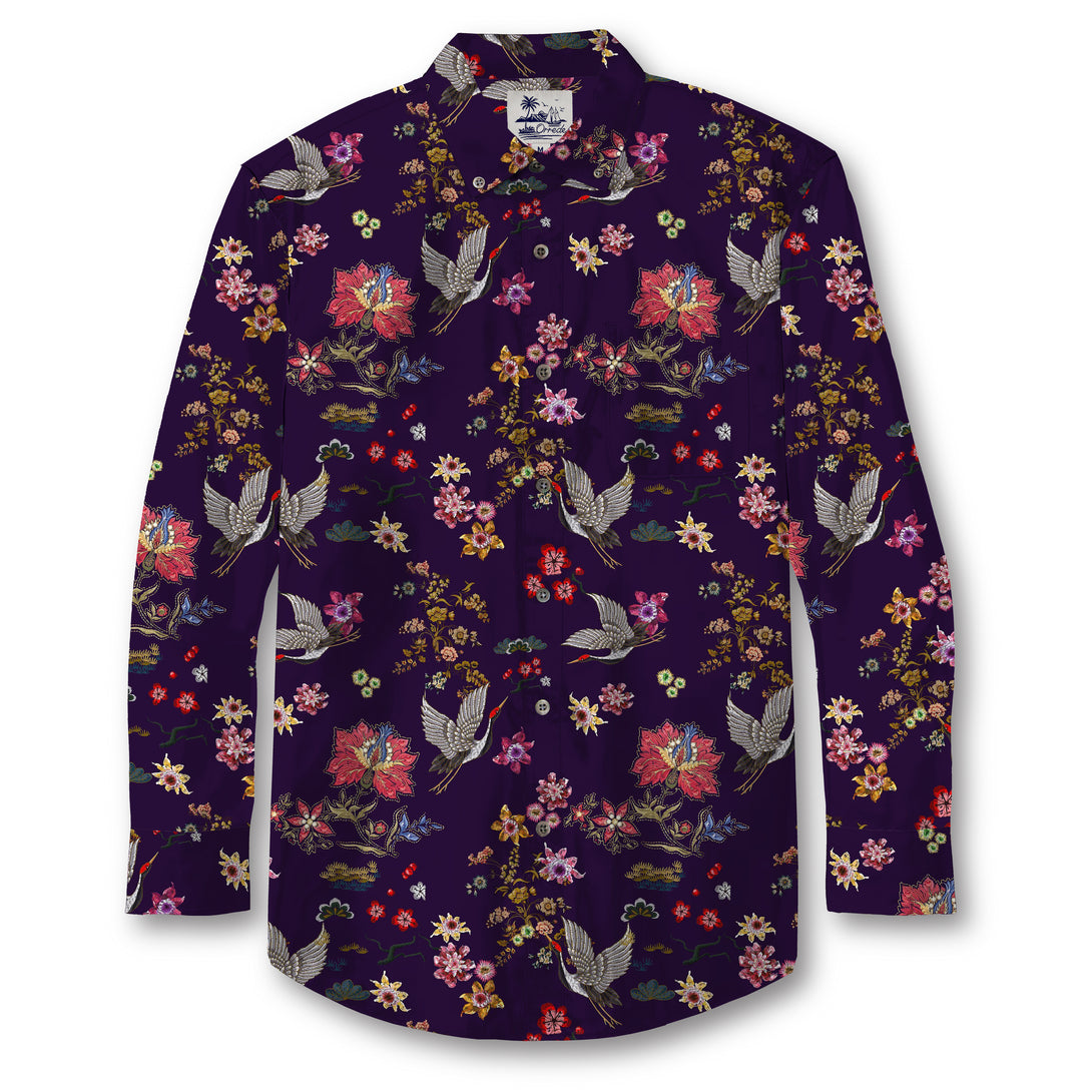 A symphony of twilight hues and graceful motion, this pattern features elegant cranes mid-flight against a deep, moody violet background. Surrounding them are vibrant florals—lilies, cherry blossoms, and exotic petals—woven like notes in a poetic landscape. Golden branches twist delicately between blooms, while subtle dragons and swirling clouds add a mystical undertone. The result is a mesmerizing fusion of natural grace and mythical allure, capturing the moment where night meets imagination.
