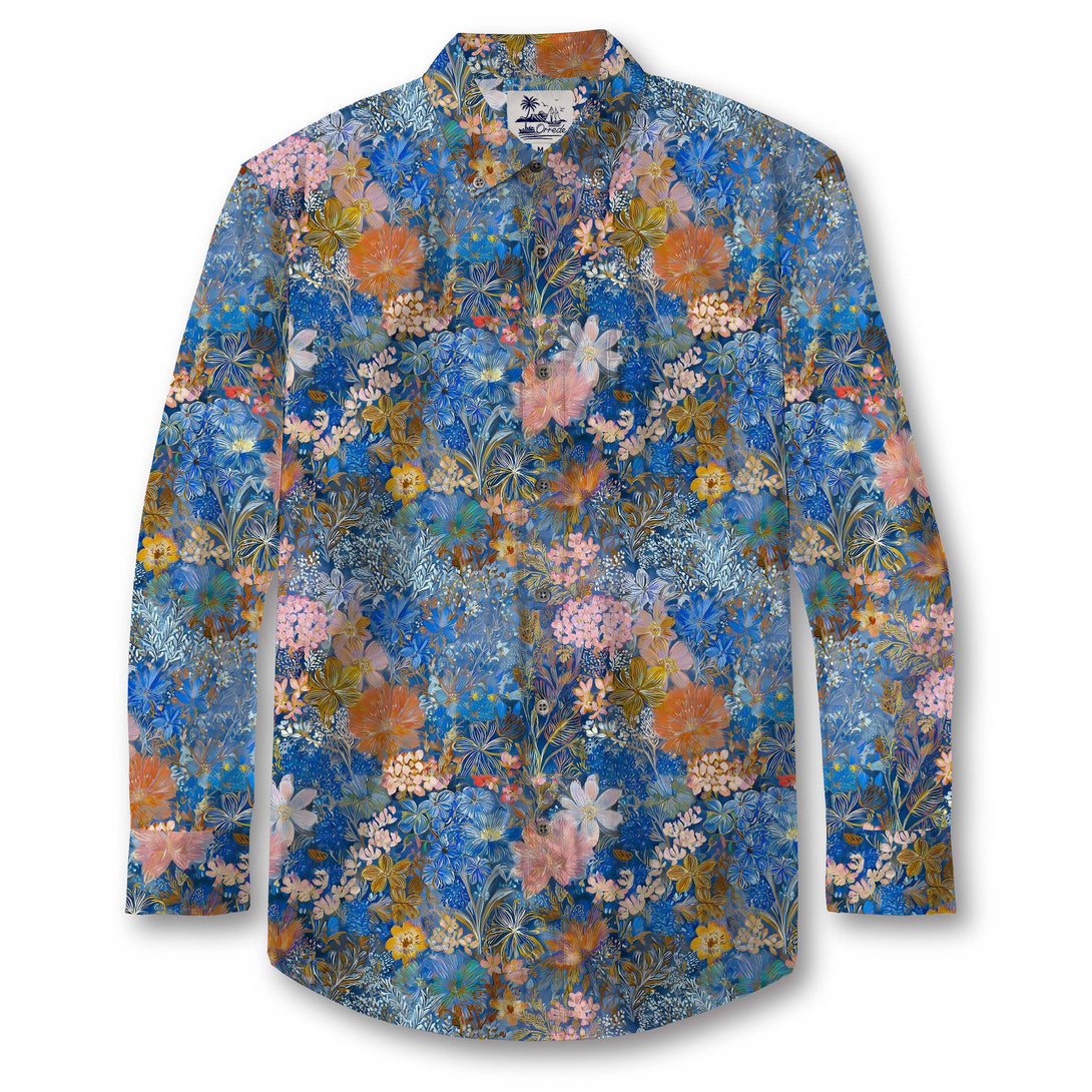 This shirt features a vibrant, tropical floral pattern that blends soft pastel hues with deep blues, creating a lively and refreshing aesthetic. The design is filled with a mix of lush flowers, including pink hibiscuses, orange lilies, and white orchids, intertwined with delicate leaves and smaller blooms.