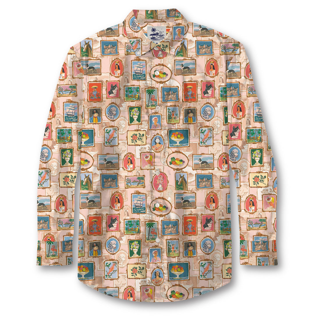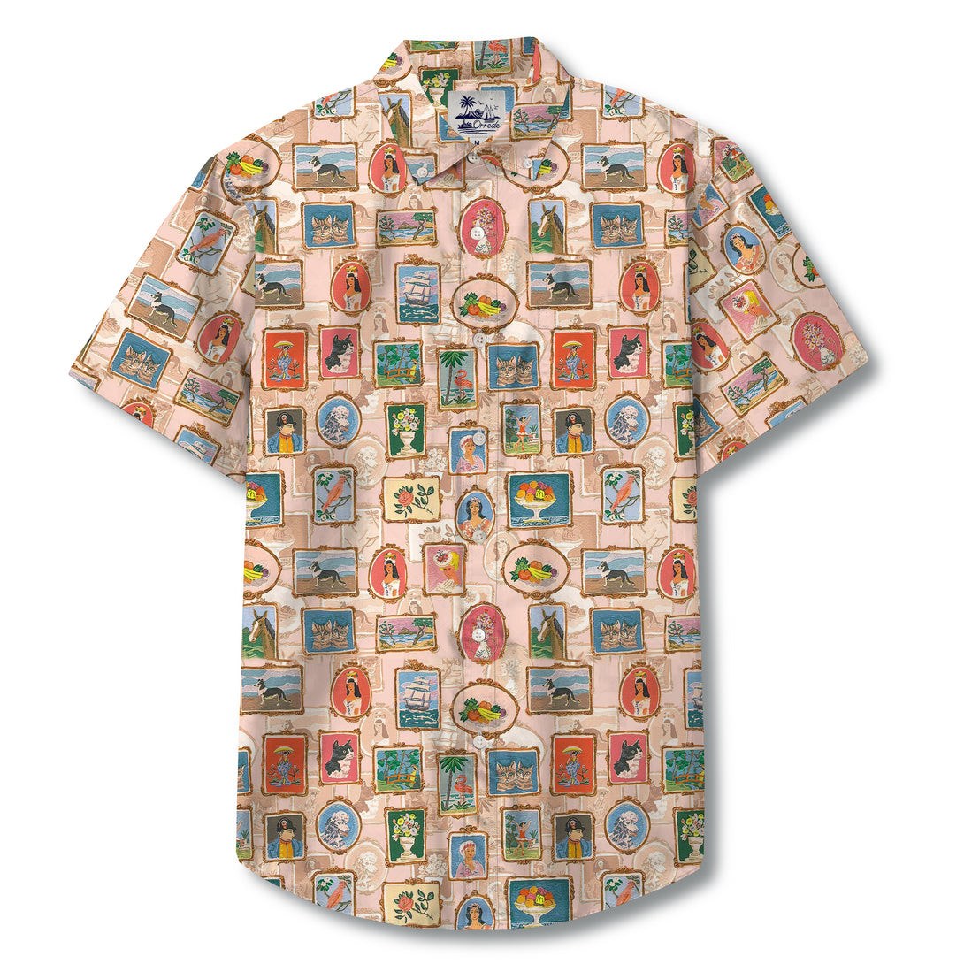 This shirt features a playful collage of framed illustrations, arranged like a quirky gallery wall. The motifs include black cats, tropical landscapes, exotic animals, portraits, and still-life images, each bordered with ornate frames in warm tones of red, gold, and blue. The soft beige background enhances the vintage postcard aesthetic, giving the shirt a nostalgic and artistic charm — perfect for someone who loves collecting memories and telling stories through style.