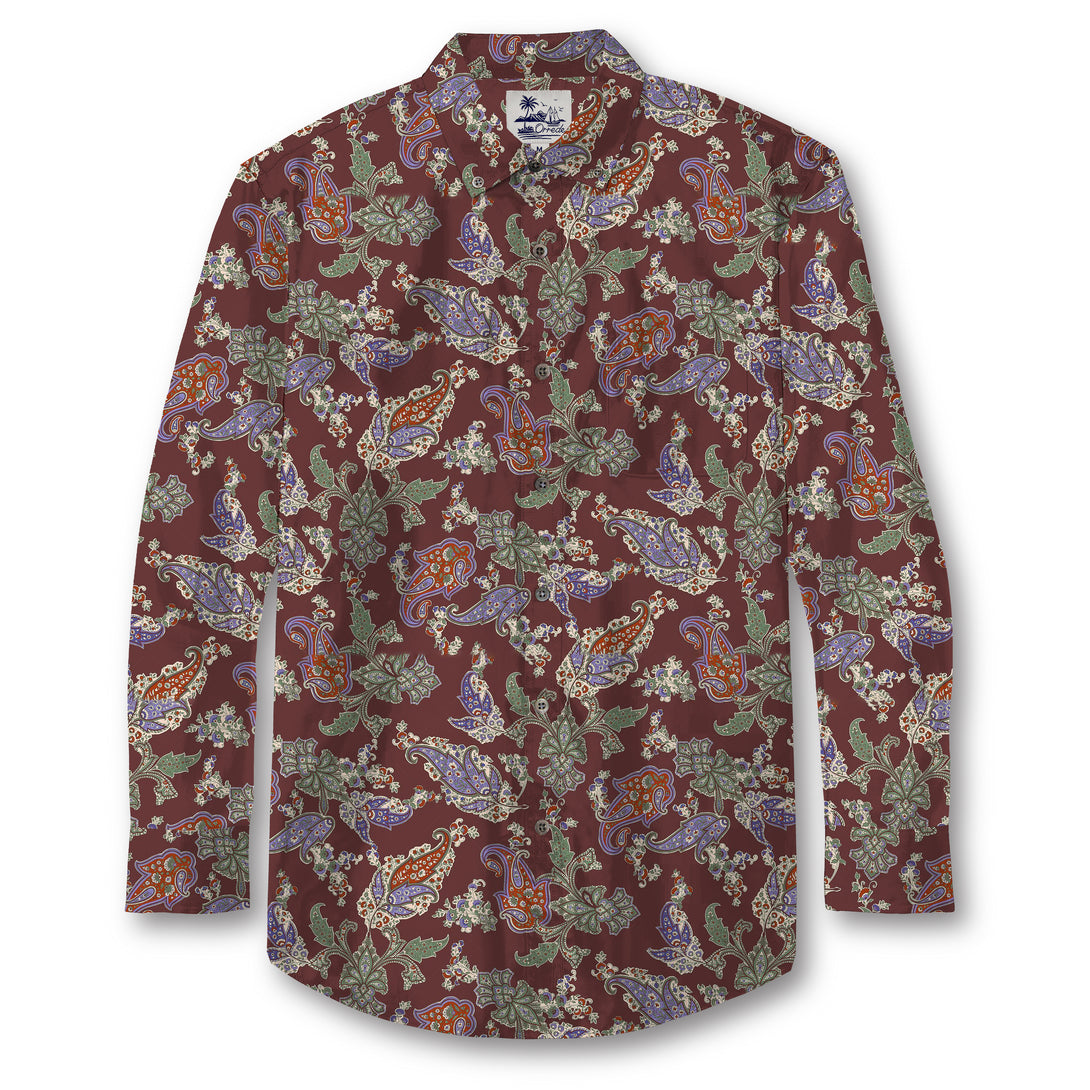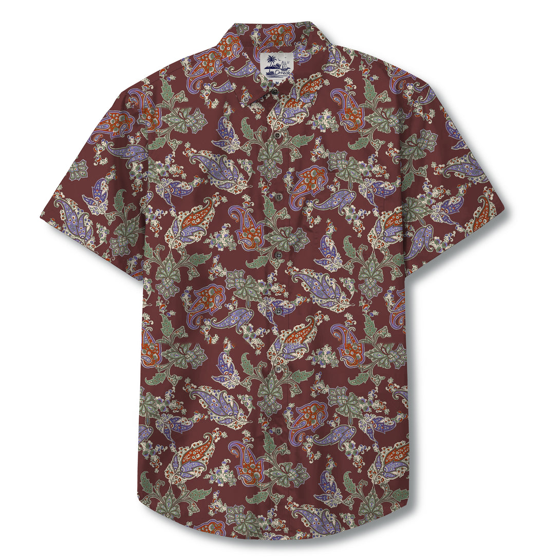 This shirt features a rich maroon base adorned with an intricate mix of paisley and floral patterns. The design blends traditional paisley swirls in purple, orange, and cream tones with leafy green motifs and delicate white blossoms. The overall aesthetic is both vintage and tropical, evoking the feeling of a lush garden in full bloom. The layout of the print flows organically across the fabric, giving the shirt a dynamic and artistic look perfect for relaxed summer days or statement casual wear.