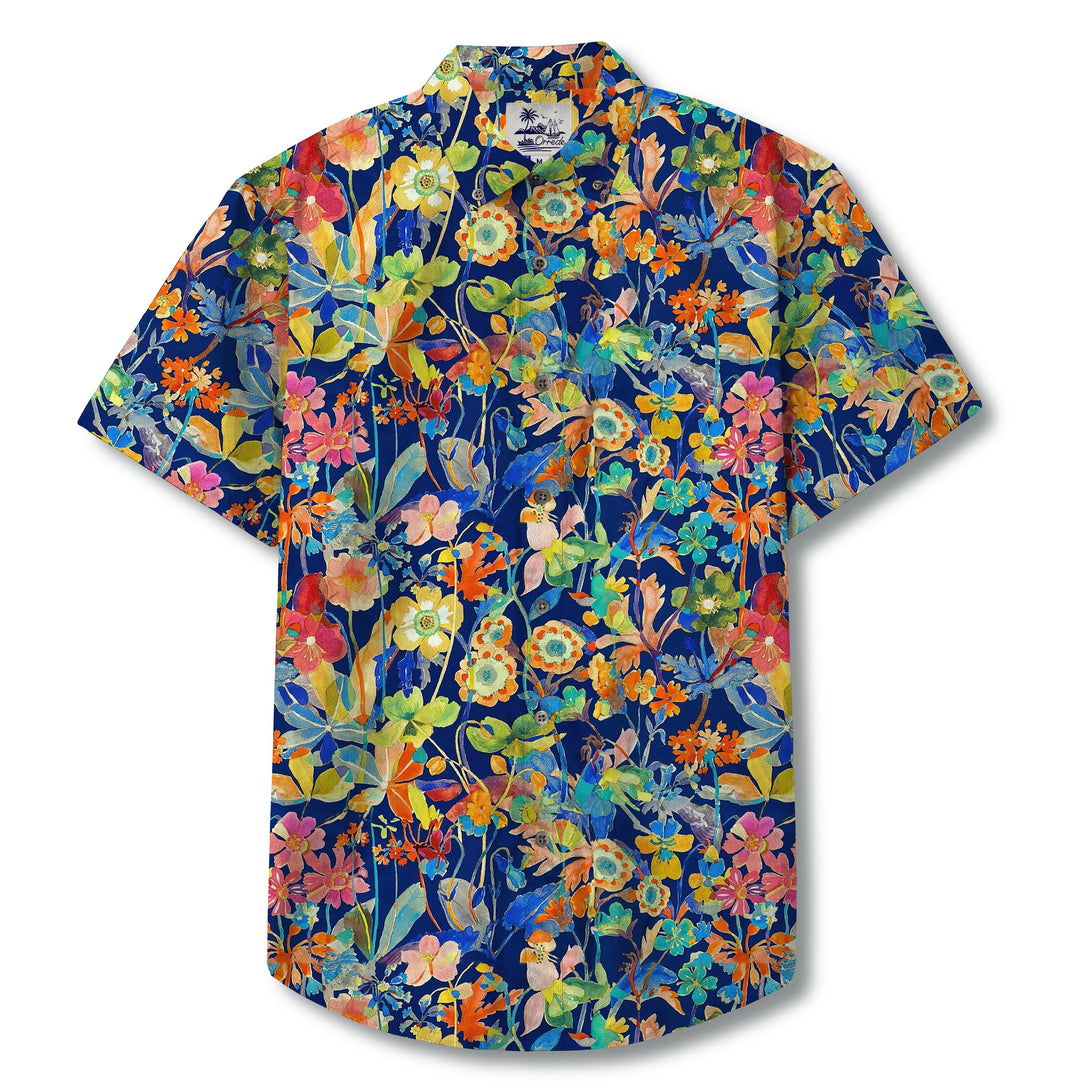 This vibrant shirt pattern bursts with life, featuring a rich tapestry of hand-painted flowers in full bloom. Set against a deep midnight blue background, the design combines vivid oranges, pinks, greens, and yellows with intricate botanical details. The composition evokes the feeling of a lush garden thriving under moonlight, blending the elegance of watercolor textures with the wild charm of nature in motion. Ideal for someone who appreciates both artistic flair and the beauty of untamed florals.