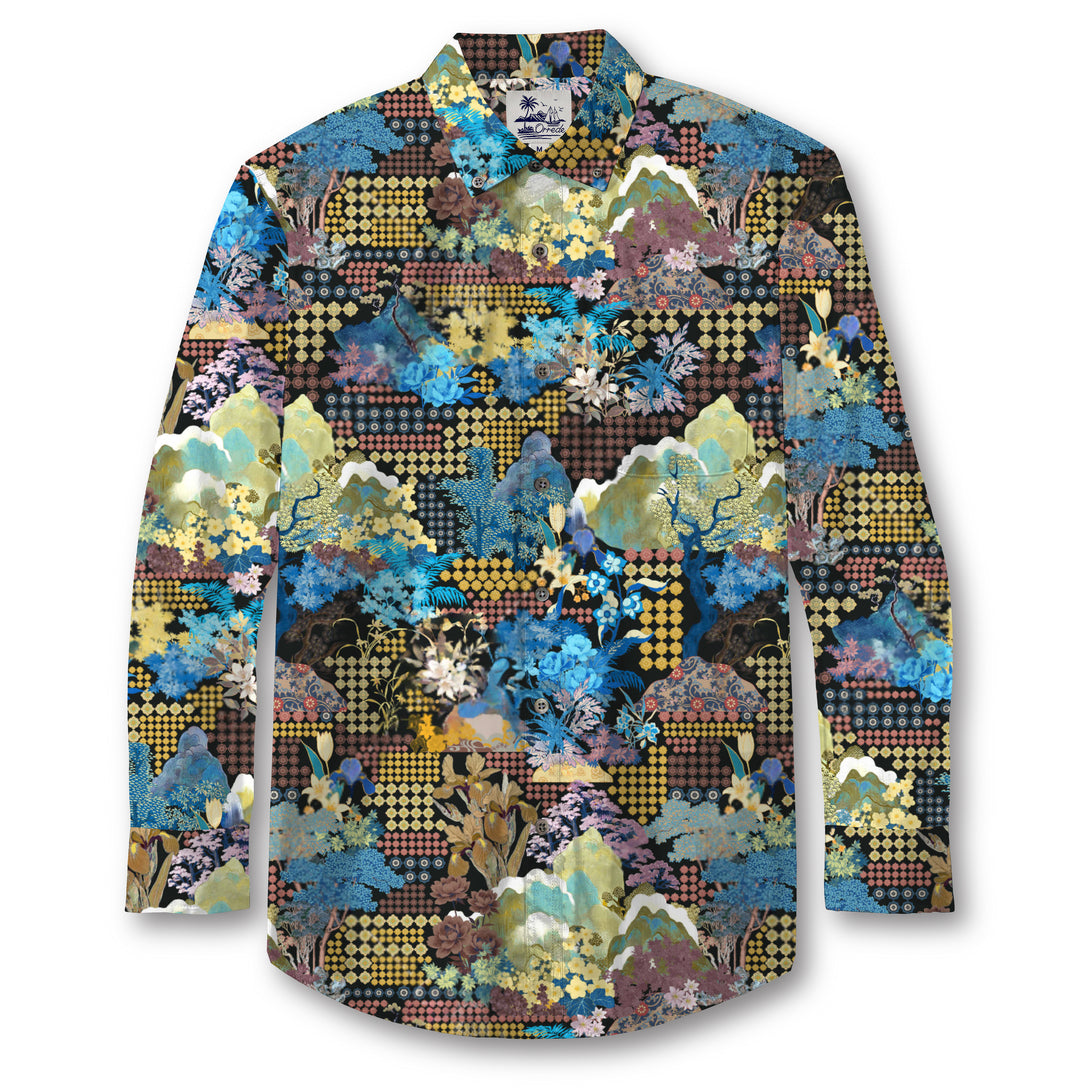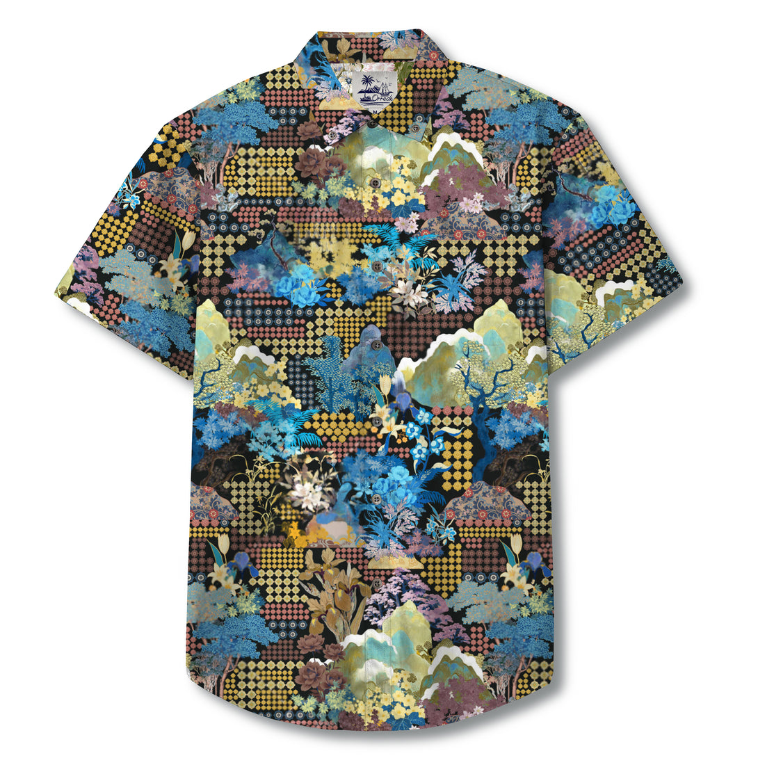This distinctive printed shirt features a black base that artfully merges natural landscapes with geometric aesthetics. Blue-green mountains rise among a vibrant tapestry of blossoms in shades of blue, yellow, pink, and white, while yellow and brown lattice patterns weave through the design. The result is a striking fusion of vintage charm and artistic modernity — a harmonious blend of nature’s beauty and geometric precision, full of depth, texture, and refined design flair.
