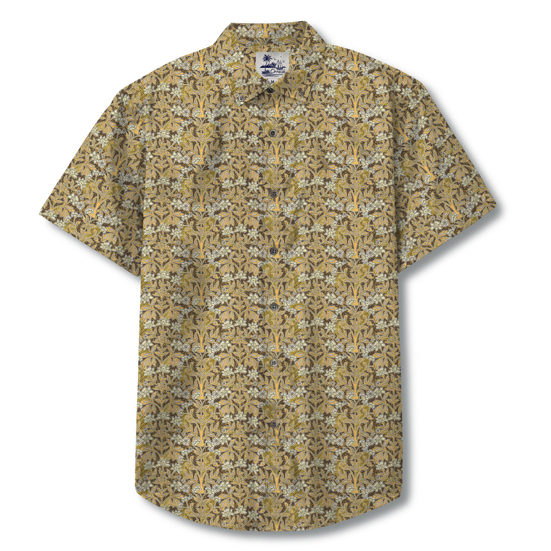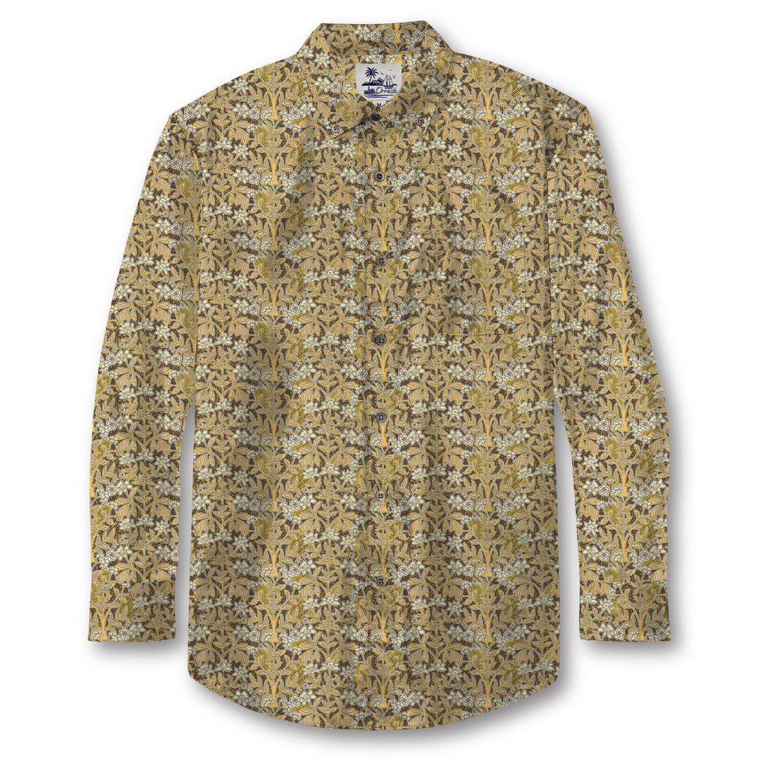 This shirt features a densely detailed botanical print, where clusters of golden-yellow leaves and soft ivory blossoms intertwine in a continuous flow. The intricate foliage layers create a sense of richness and depth, evoking the texture of a lush tropical forest floor. Subtle earthy tones balance the brightness, giving the pattern a vintage yet refined aesthetic.