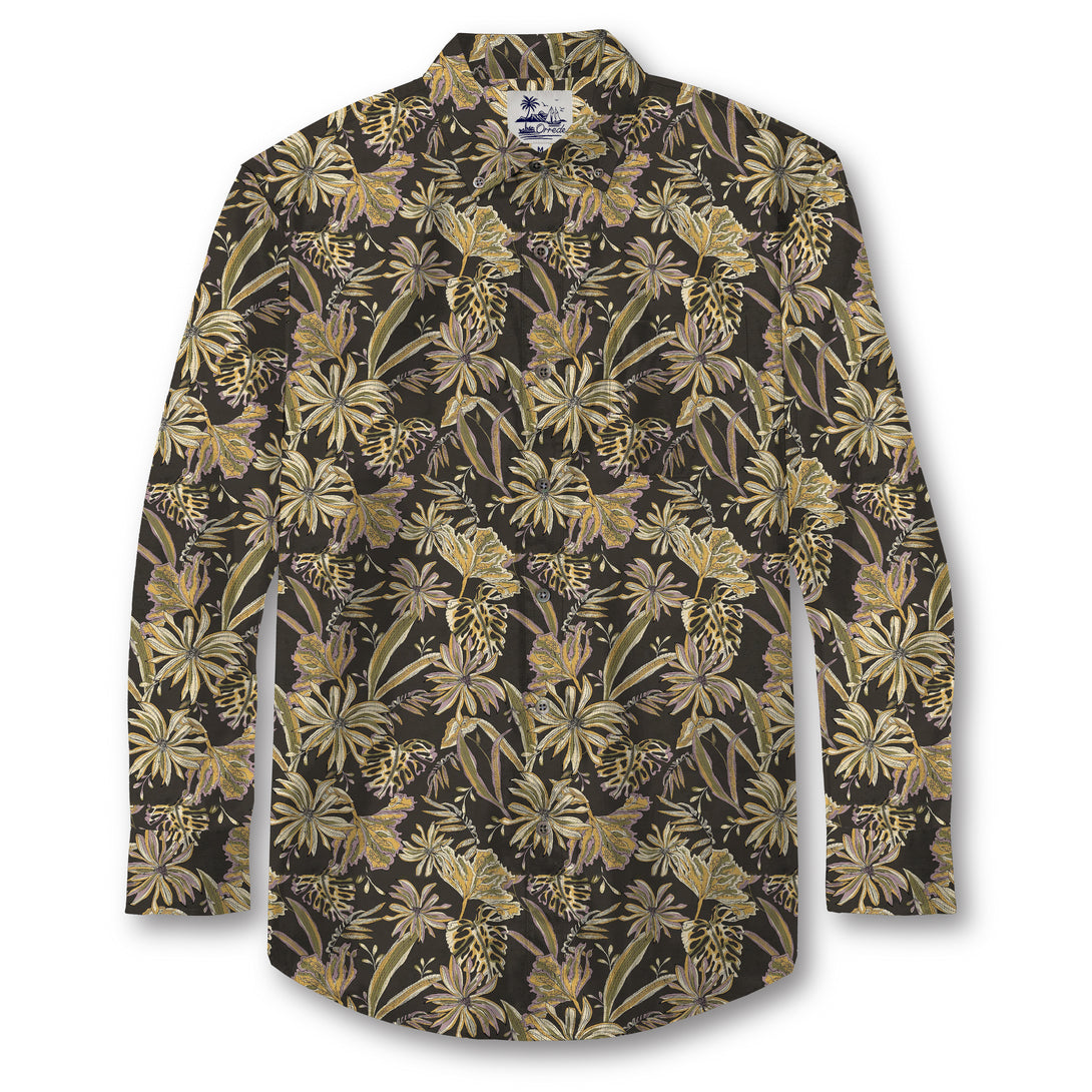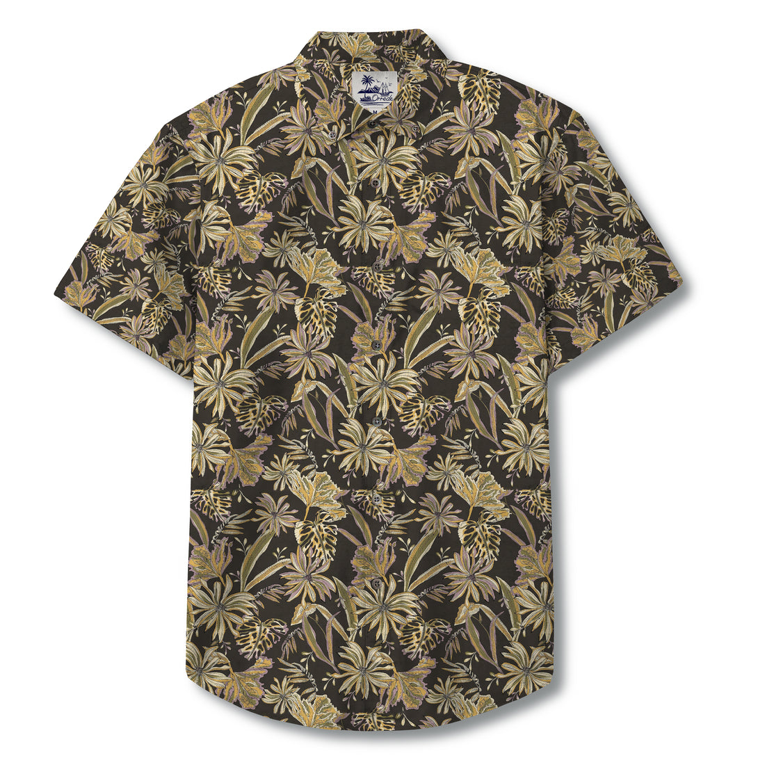 The Golden Canopy pattern captures the quiet elegance of a tropical forest bathed in twilight. Shades of muted gold, olive, and bronze form lush palm leaves and exotic blossoms that seem to glow against a deep, charcoal background. The intricate layering of foliage evokes the play of moonlight through dense trees, creating a warm yet mysterious atmosphere. It’s a design that balances natural richness with understated sophistication — perfect for those who appreciate subtle luxury in a tropical form.