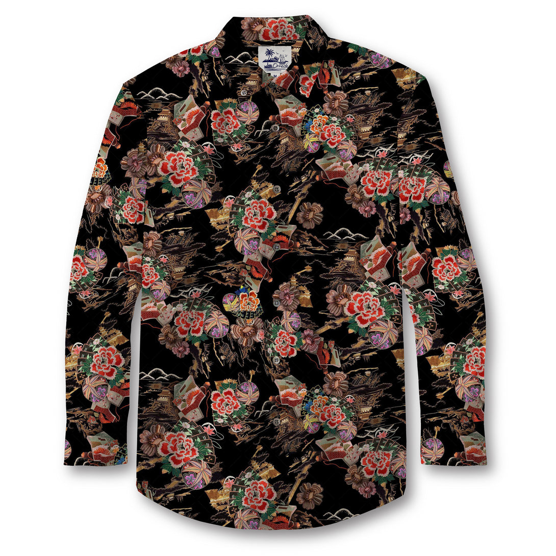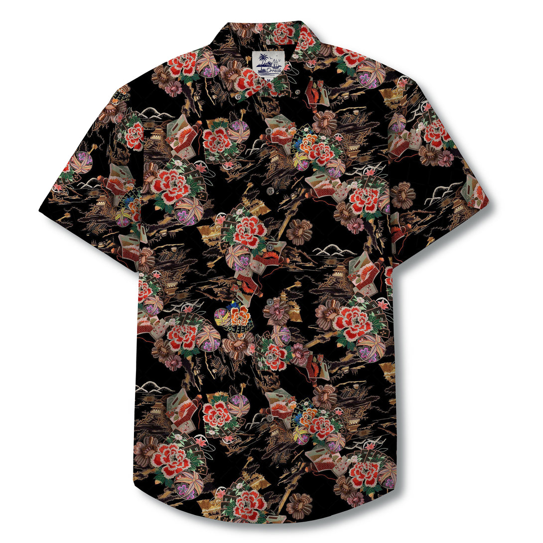 This design features a dramatic interplay of traditional Japanese artistry on a deep black background. Lush crimson peonies bloom vibrantly alongside muted golden chrysanthemums, symbolizing beauty and resilience. Interwoven with these florals are intricate motifs of folding fans, ornate temari balls, and classic Japanese architecture, rendered in warm earthy tones of gold, brown, and ivory. Flowing wave-like accents in soft white create a sense of movement and harmony, while the rich contrast of colors evokes timeless elegance.