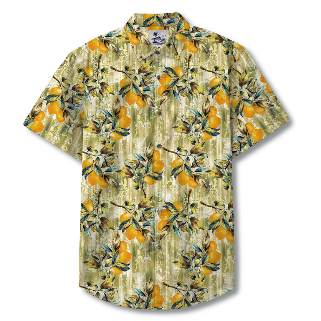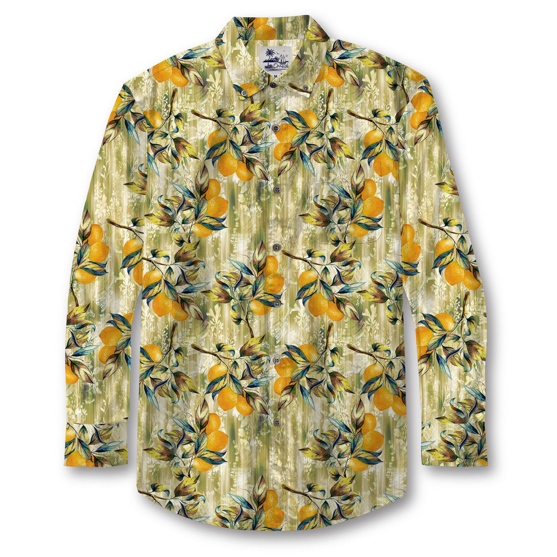 The Golden Grove pattern bursts with the radiant charm of sun-ripened oranges nestled among lush green leaves. Set against a textured backdrop of vertical brushstrokes in earthy tones, the design evokes a breezy orchard bathed in golden light. The painterly strokes and delicate foliage lend the shirt a hand-crafted, almost watercolor-like softness, perfect for those who want to carry the warmth of summer with them wherever they go. Ideal for a stroll through nature—or just looking like you belong in one.