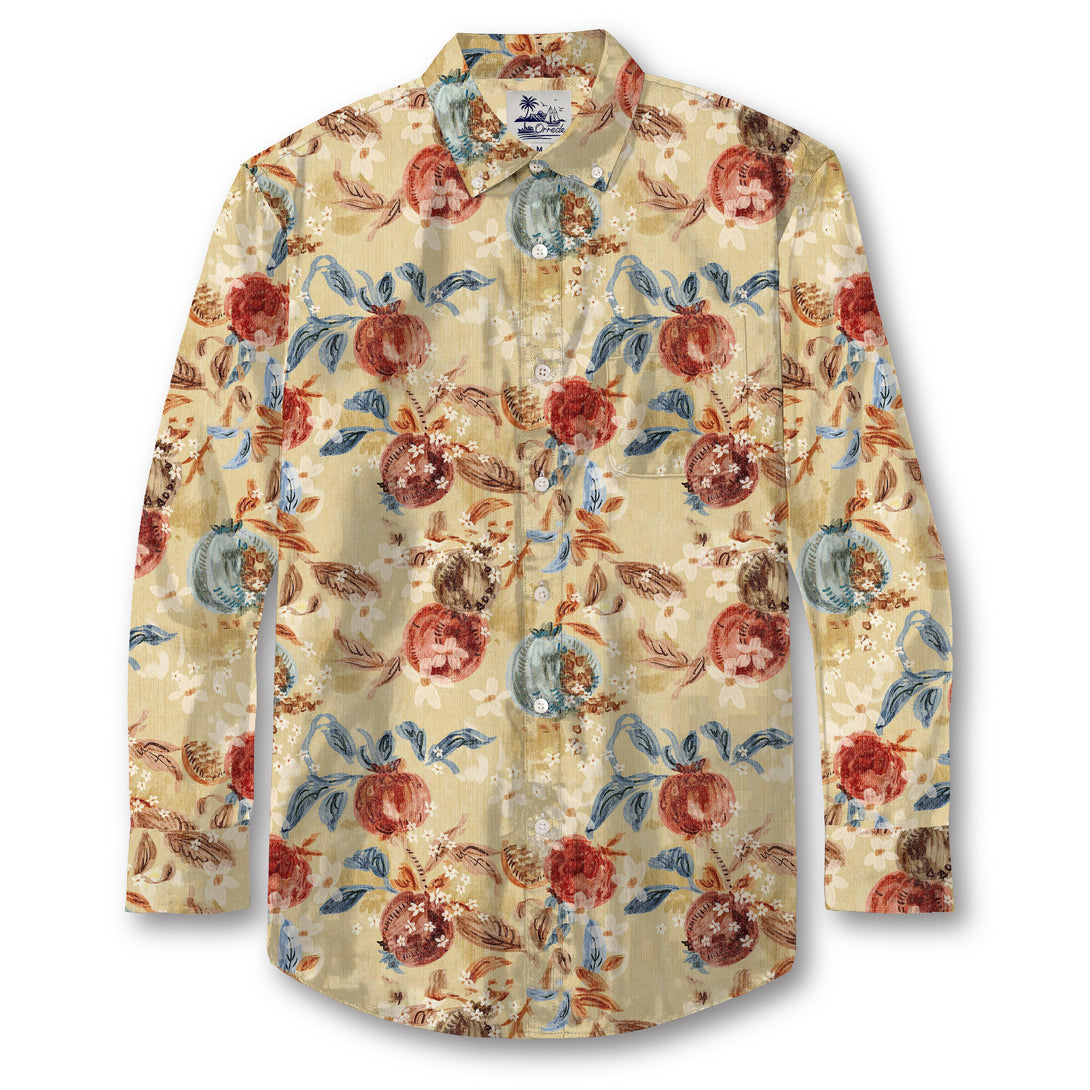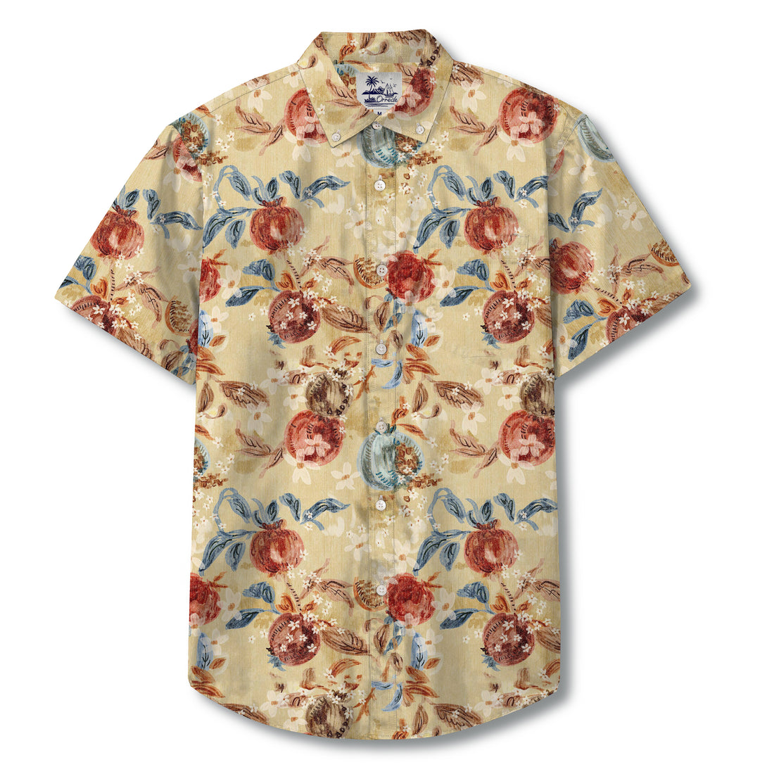 This shirt features a painterly design inspired by lush orchard harvests. Warm golden tones set the background, adorned with pomegranate-like motifs in earthy reds and browns, accented by soft teal leaves and delicate floral touches. The brushstroke effect gives the pattern an artistic, hand-painted feel, blending rustic elegance with a relaxed tropical vibe.
