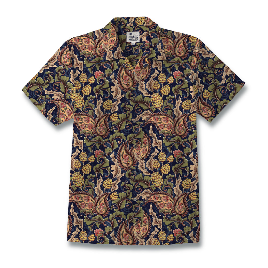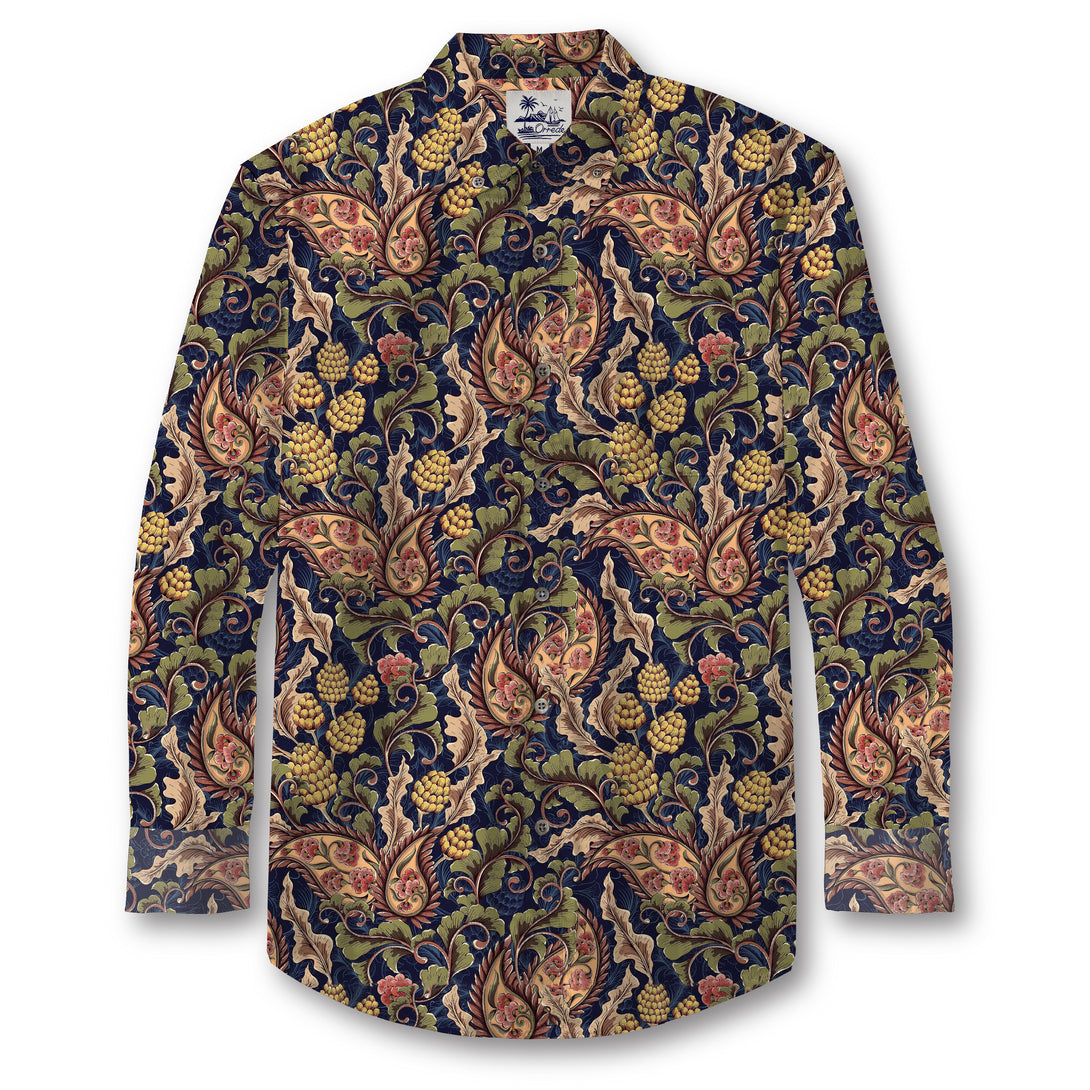 Inspired by vintage European tapestry art, Golden Vine Reverie features a lush interplay of curling leaves, golden grapes, and soft floral accents. The rich navy background enhances the depth of the earthy greens, muted reds, and antique golds, creating a timeless sense of opulence. The composition flows like an ornate garden—structured yet organic, elegant yet full of life.