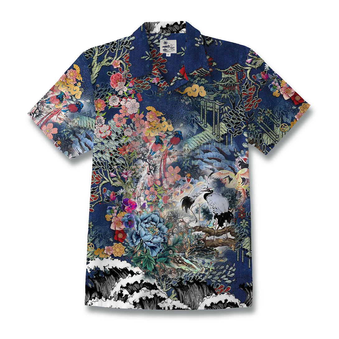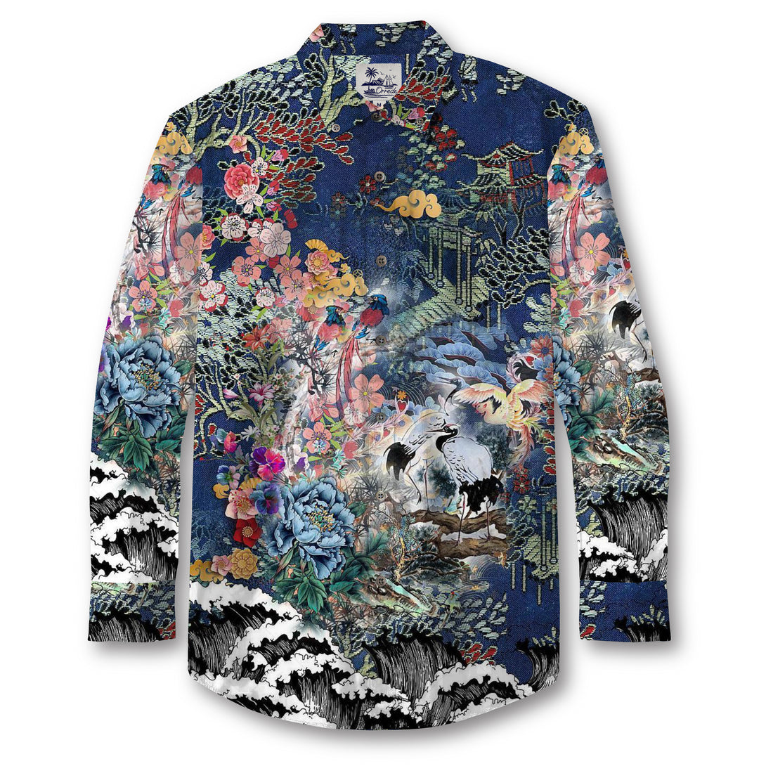 This shirt features a richly layered tapestry of traditional East Asian motifs, blending nature and architecture into a majestic visual narrative. At the heart of the design, elegant cranes and vibrant phoenixes are depicted amidst lush floral clusters of peonies and cherry blossoms, symbolizing longevity and rebirth. Ornamental pagodas and golden clouds float through a textured indigo background, creating a dreamlike atmosphere. The lower hem showcases dynamic black-and-white ocean waves, anchoring the ethereal composition with bold contrast. The overall effect is both regal and poetic—a harmonious tribute to classical Eastern art.