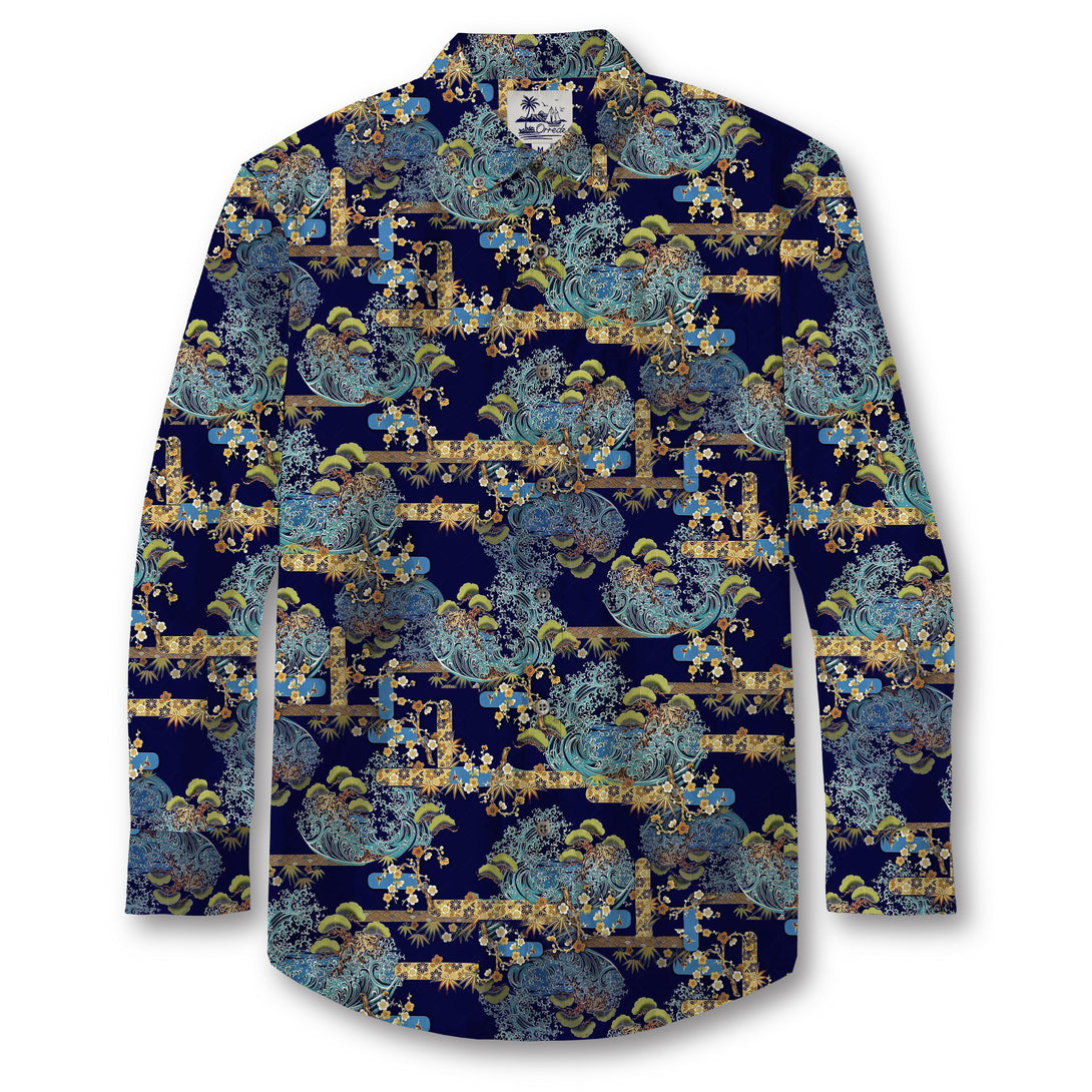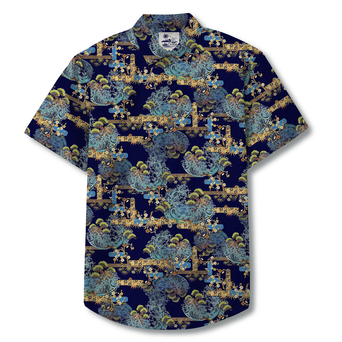 This intricate pattern is a harmonious blend of traditional Asian artistic elements and luxurious detailing. Set against a deep navy blue background, the design features ornate golden frames interwoven with delicate cherry blossoms, exuding an air of refined elegance. Stylized swirling waves and misty clouds flow through the composition, accompanied by lush pine trees, symbolizing resilience and longevity. The symmetrical layout enhances the regal aesthetic, making this pattern a perfect fusion of heritage and sophistication.