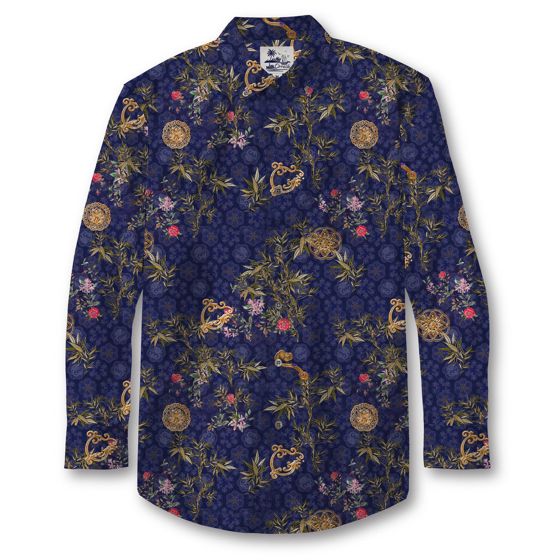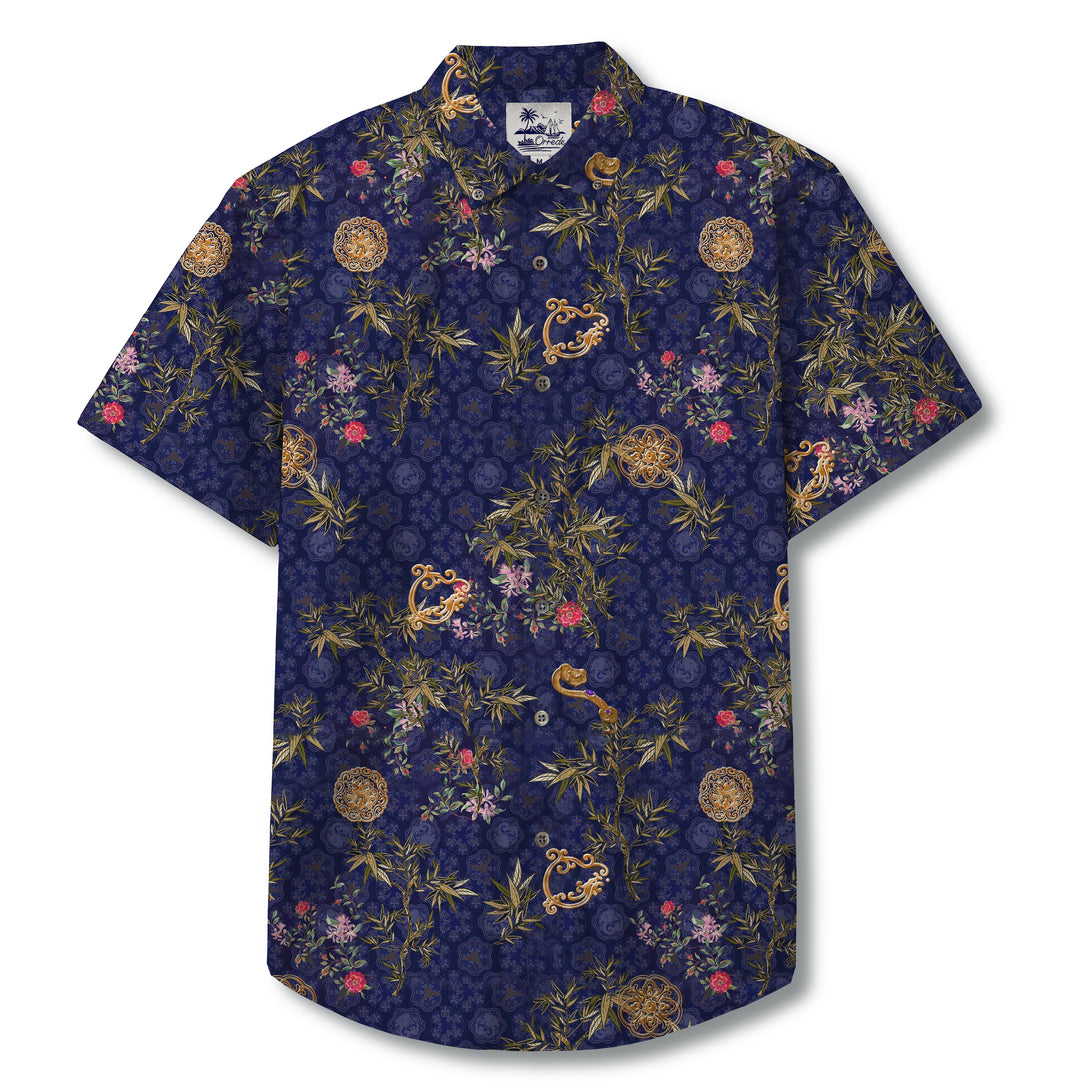 Set against a deep navy background, Imperial Whisper weaves together a tapestry of golden bamboo, antique scrollwork medallions, and delicate botanical accents. Crimson and violet blooms peek through lush greenery, while intricate oriental motifs—such as ancient coins and jade-hued clasps—evoke a sense of dynastic elegance. The overall composition feels like a walk through an imperial garden under moonlight—rich, refined, and quietly powerful.