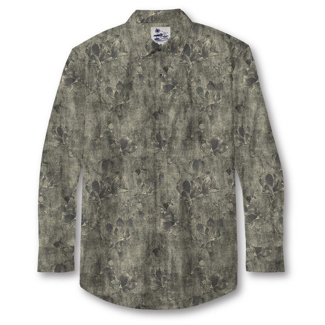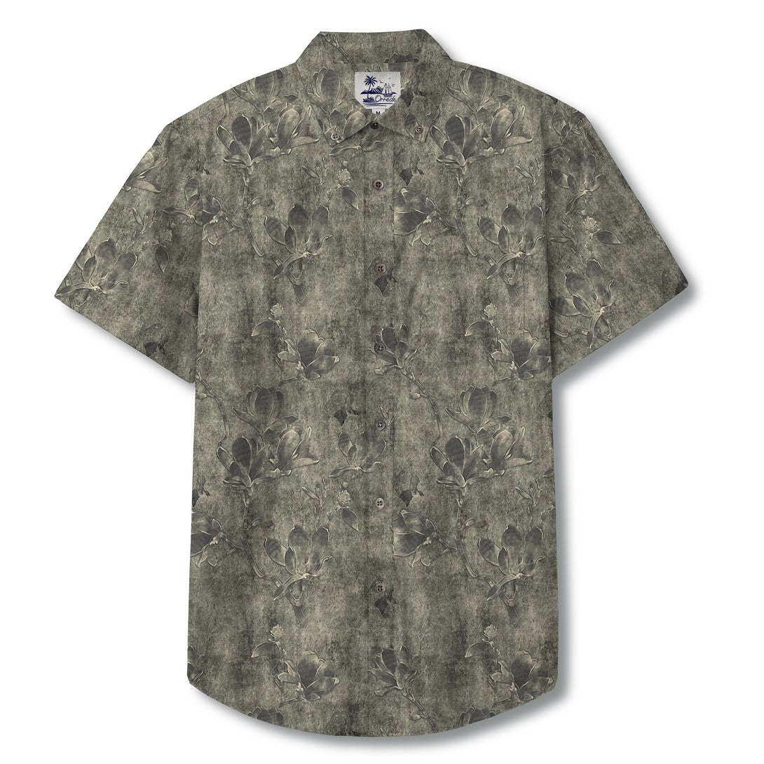This shirt features a subdued and elegant botanical design, showcasing magnolia blossoms and branches subtly emerging from a textured, weathered background. The muted gray and charcoal tones lend the pattern an antique, almost parchment-like appearance, evoking the feel of an ink wash painting or an aged botanical illustration. The overall aesthetic is understated yet sophisticated, reminiscent of traditional Eastern art and the quiet beauty of nature preserved in time.