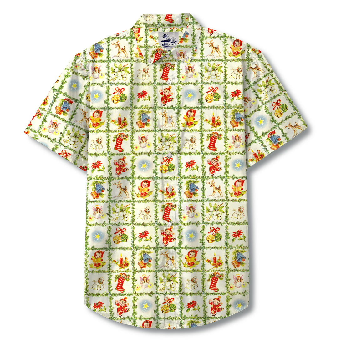 This shirt features a festive and whimsical design with a variety of holiday-themed motifs arranged in a grid pattern. Each square showcases a different scene, such as playful teddy bears in Christmas hats, stockings filled with gifts, reindeer, poinsettia flowers, and traditional ornaments. The color palette is bright and cheerful, with shades of red, green, blue, and white, evoking the joyful spirit of the holiday season. The decorative greenery framing each square adds a cohesive and celebratory feel to the overall design.