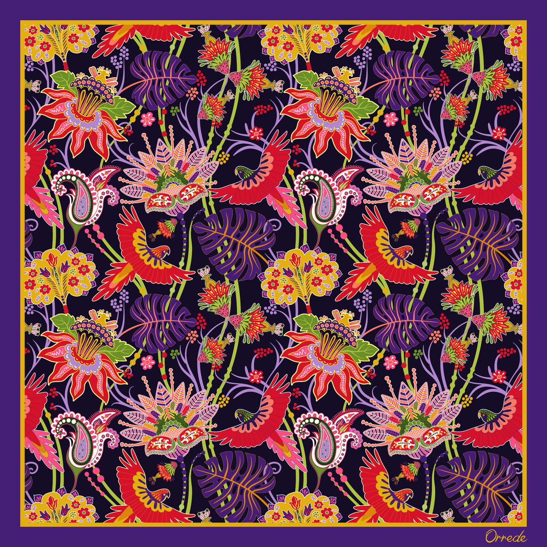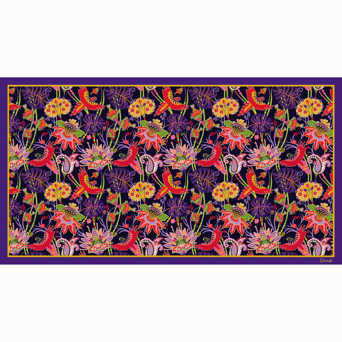 A vibrant celebration of tropical flora and fauna, Jungle Jubilee bursts with life on a deep navy canvas. Bold parrots in fiery reds and oranges swoop between lush purple monstera leaves and dazzling flowers in pink, yellow, and green. Delicate paisley motifs and intricate botanical details weave throughout the design, creating a dynamic, almost festival-like atmosphere. This pattern captures the wild beauty and rhythm of a rainforest in full bloom — exotic, energetic, and irresistibly eye-catching.