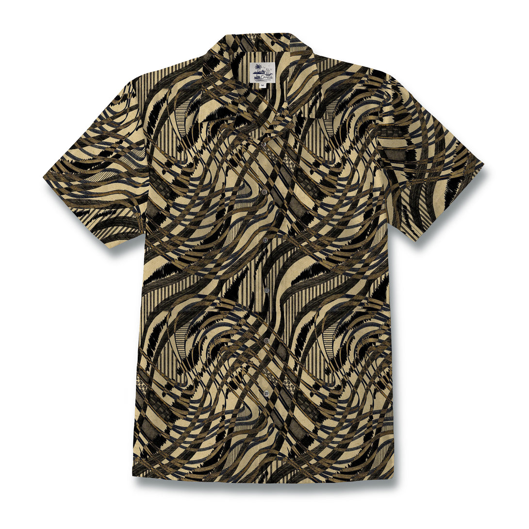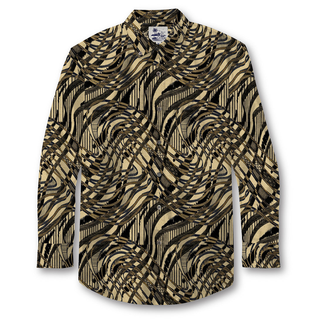 This shirt features an intricate abstract design of swirling waves and interlacing lines in shades of beige, black, and muted brown. The flowing curves create a sense of motion, while sharp-edged geometric details add depth and contrast. The overall effect is both dynamic and sophisticated, giving the fabric a modern yet timeless appeal.