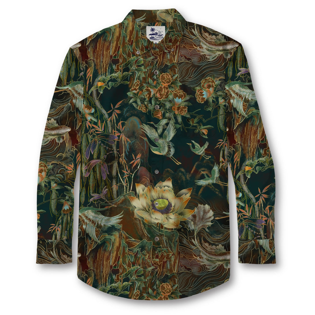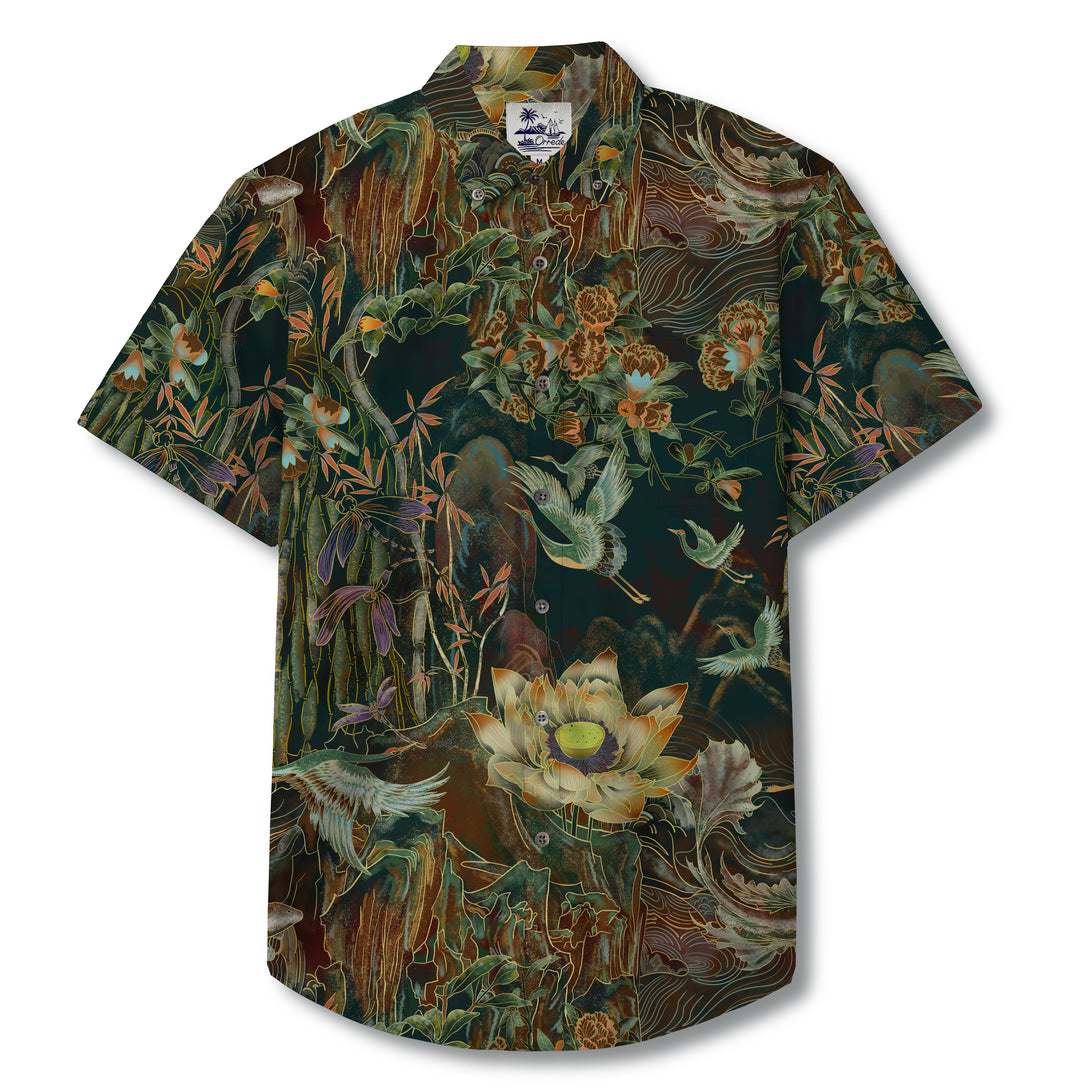 This shirt features an intricate and harmonious design inspired by traditional East Asian art. The dark background sets a dramatic tone for the vivid imagery of blooming lotus flowers, elegant cranes in mid-flight, and delicate bamboo stalks. Flowing water patterns and rugged rock formations add depth and movement to the scene. The color palette includes deep greens, rich browns, and soft golds, evoking a serene natural landscape at dusk.