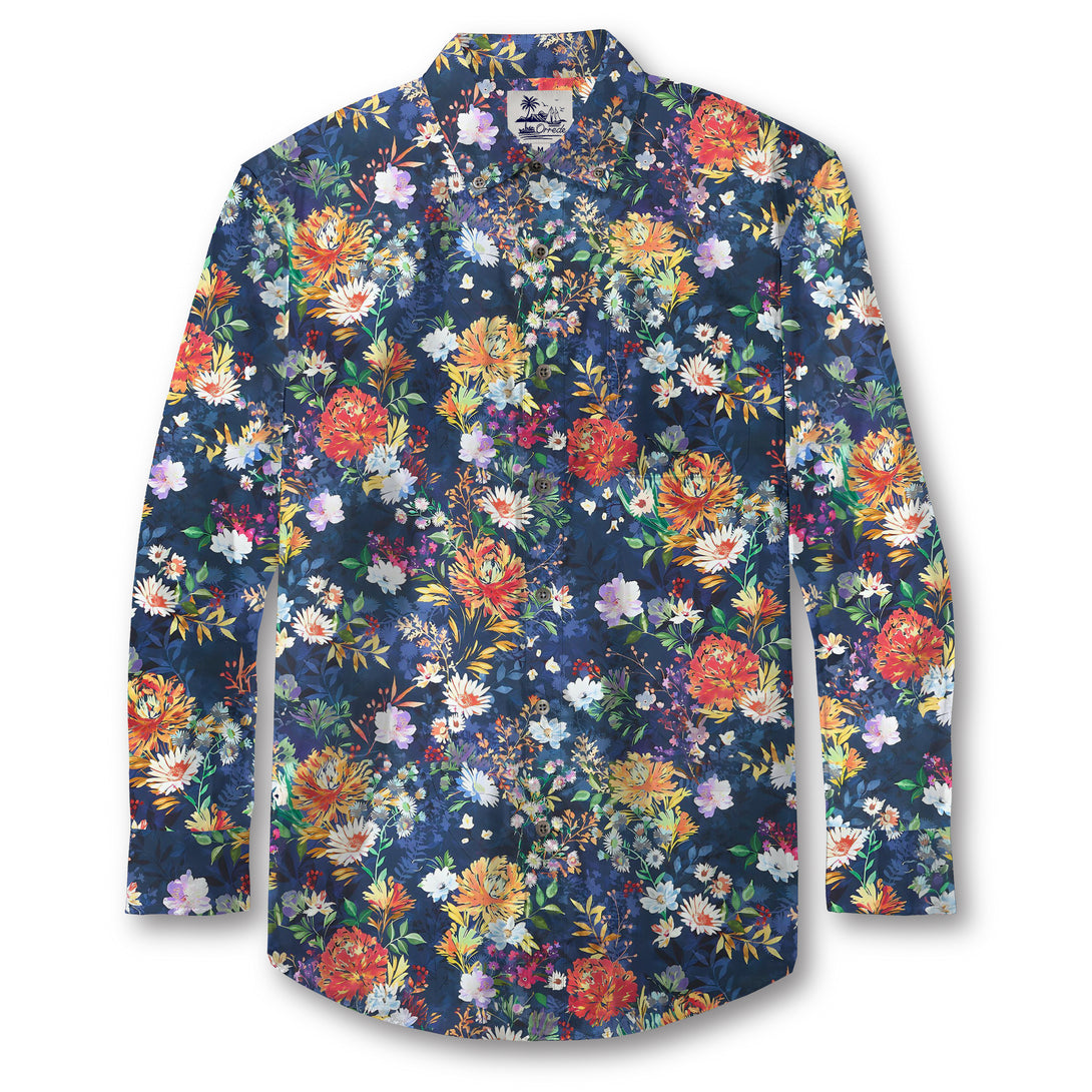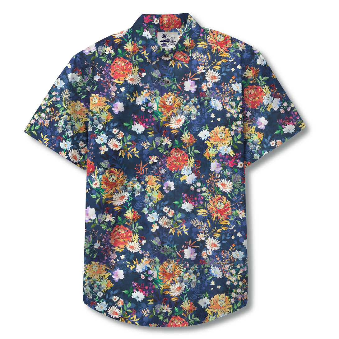 Inspired by the mystical allure of the Lycoris radiata, this pattern evokes a dreamlike floral scene under twilight skies. Set against a deep navy backdrop, the shirt showcases a vivid array of blossoms—fiery reds, golden oranges, soft purples, and creamy whites—intertwining like memories from another world. The complex layering of blooms suggests beauty tinged with mystery, echoing the symbolic nature of the彼岸花: fleeting, enchanting, and unforgettable.