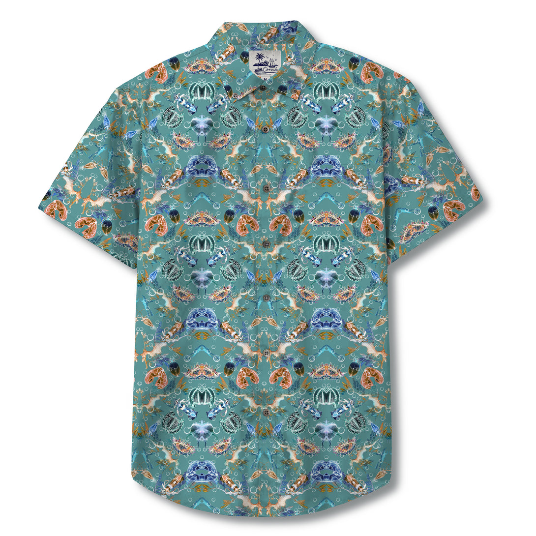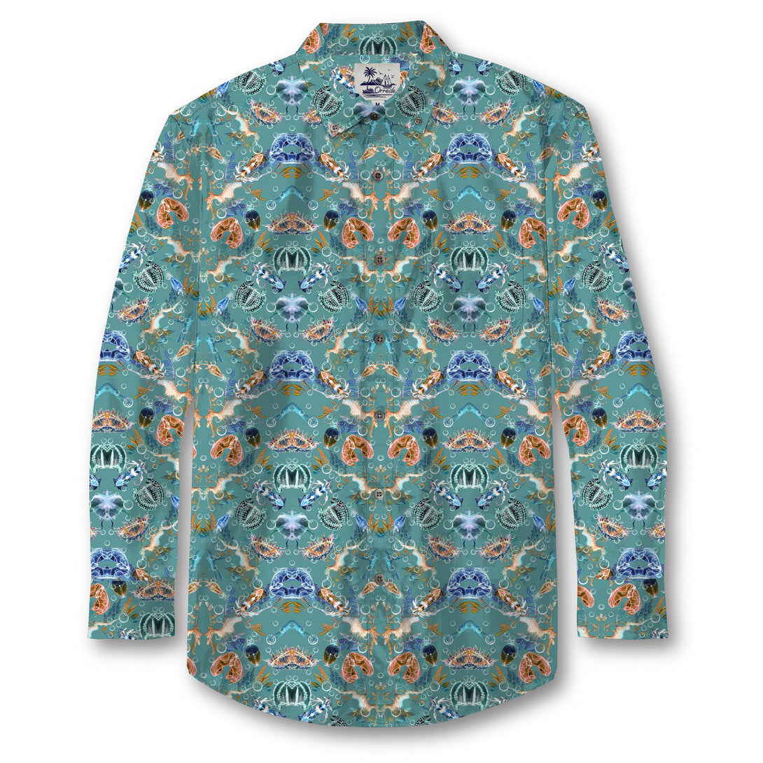This shirt features an intricate and vibrant symmetrical design set against a turquoise background. The pattern is filled with marine-inspired elements such as stylized sea creatures, coral motifs, and swirling shapes resembling ocean waves. The design includes a harmonious mix of orange, blue, and white hues, creating a striking contrast that evokes a sense of underwater fantasy. The arrangement of the elements gives the shirt a kaleidoscopic and dynamic appearance, reminiscent of marine biodiversity in a coral reef.
